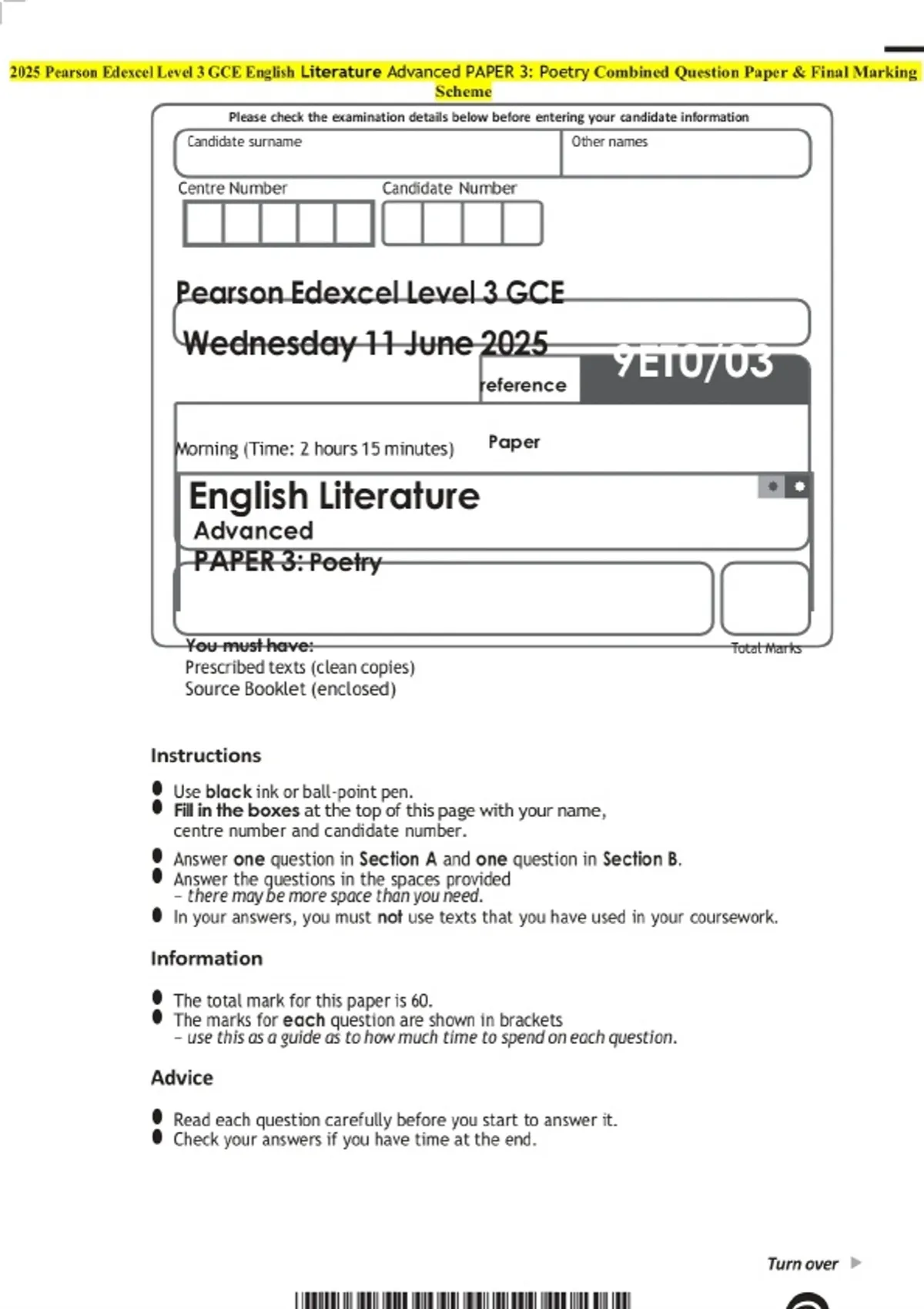 2025 Pearson Edexcel Level 3 GCE English Literature Advanced PAPER 3: Poetry Question Paper with Final Marking Guide