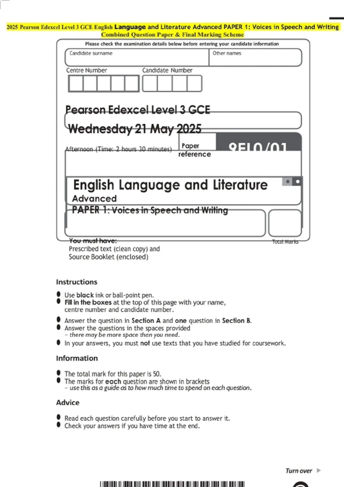 2025 Pearson Edexcel Level 3 GCE English Language and Literature Advanced PAPER 1: Voices in Speech and Writing Question Paper with Final Marking Guide