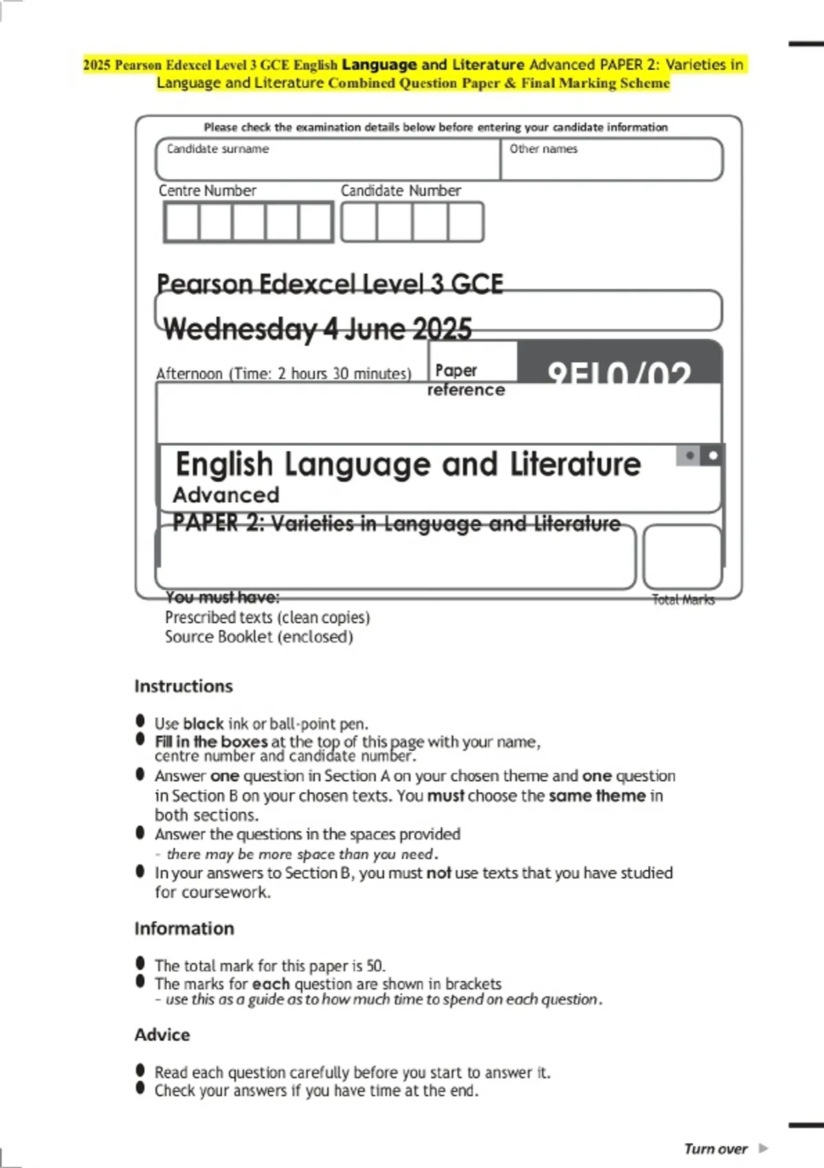 2025 Pearson Edexcel Level 3 GCE English Language and Literature Advanced PAPER 2: Varieties in Language and Literature Question Paper with Final Marking Guide