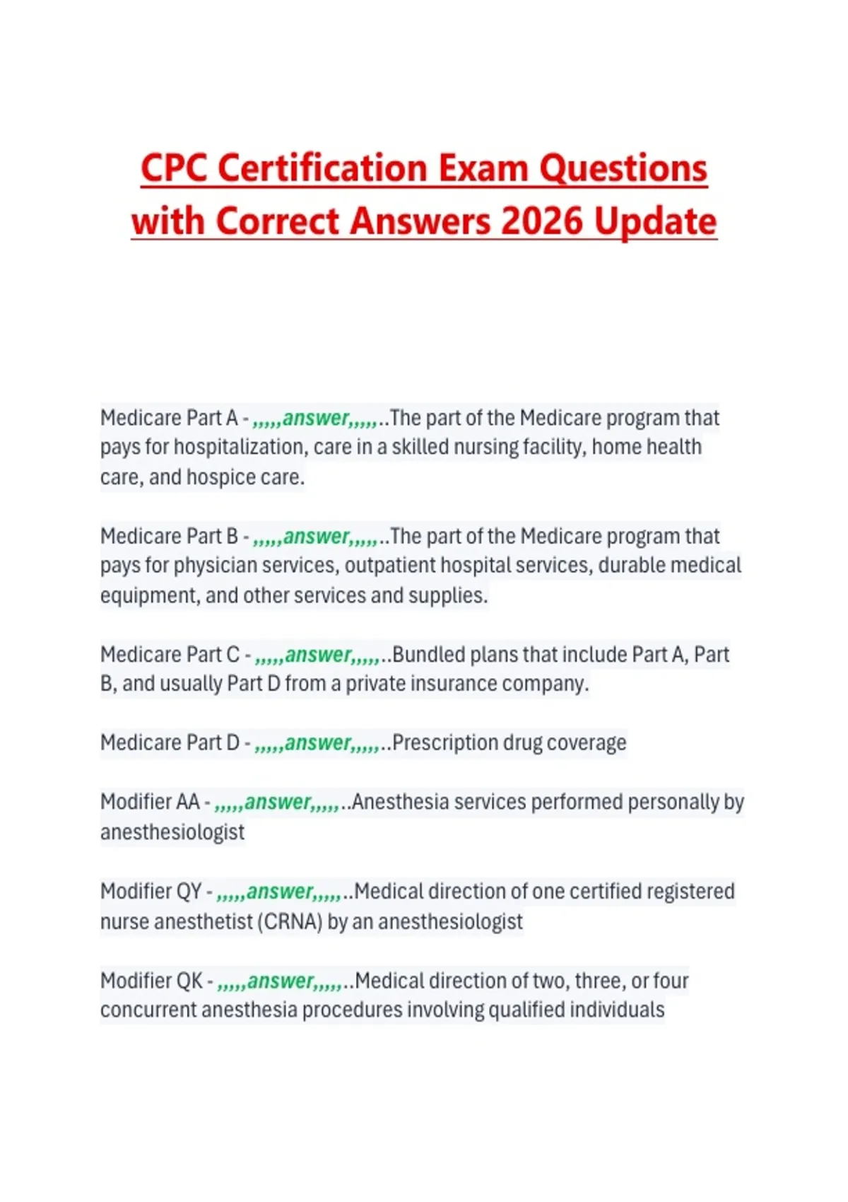 CPC Certification Exam Questions with Correct Answers 2026 Update Medicare Part A - ,,,,,answer,,,,,..The part of the Medicare program that pays for hospitalization, care in a skilled nursing facility, home health