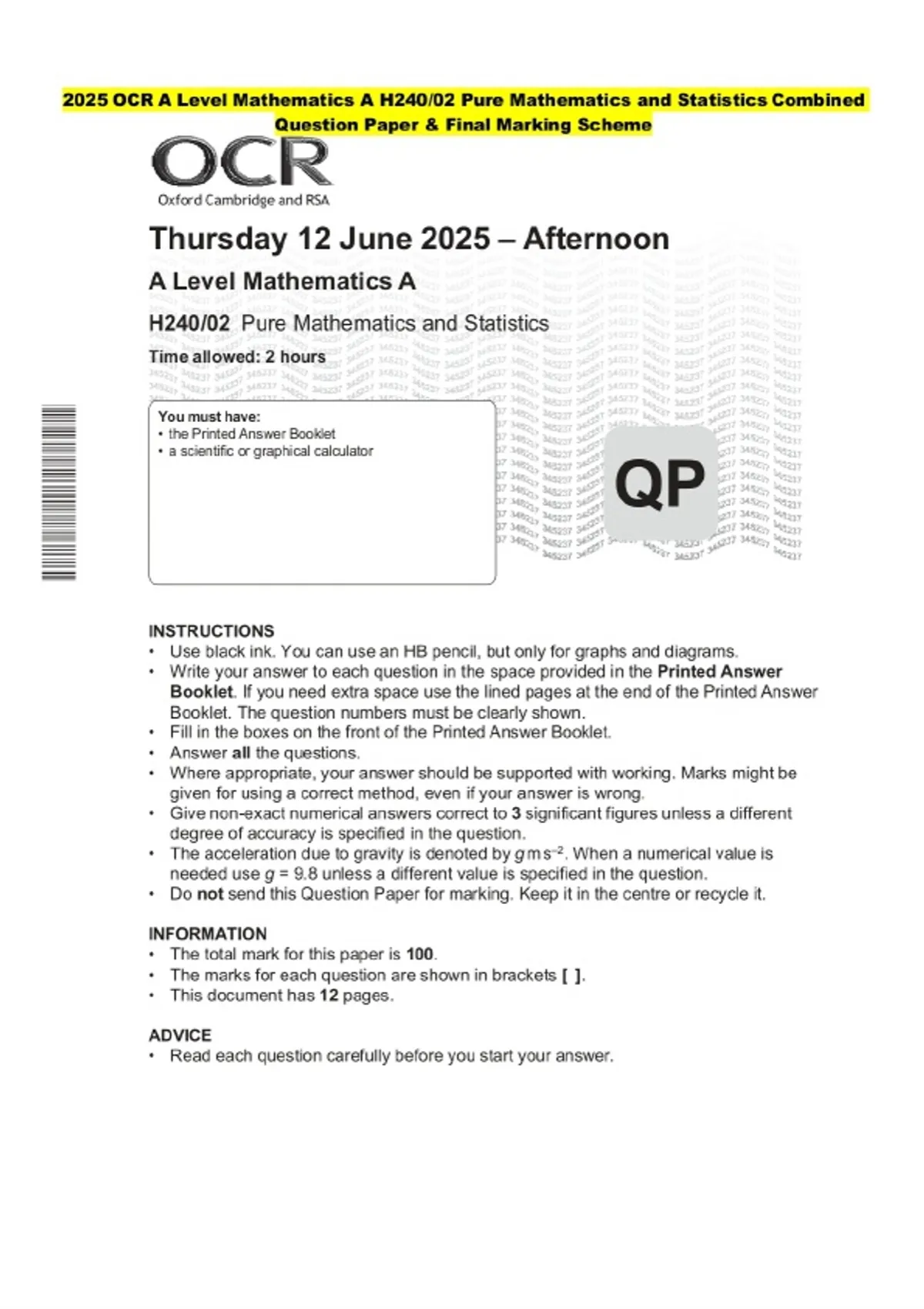 2025 OCR A Level Mathematics A H240/02 Pure Mathematics and Statistics Question Paper and Final Evaluation Scheme