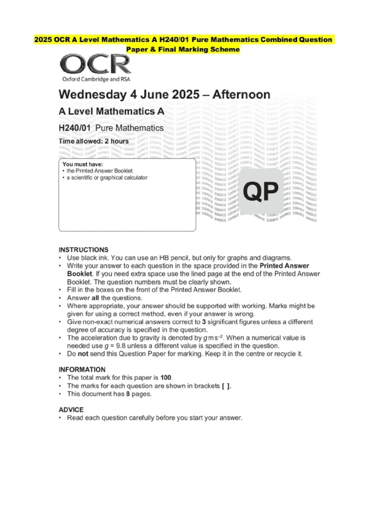 2025 OCR A Level Mathematics A H240/01 Pure Mathematics Question Paper and Final Evaluation Scheme