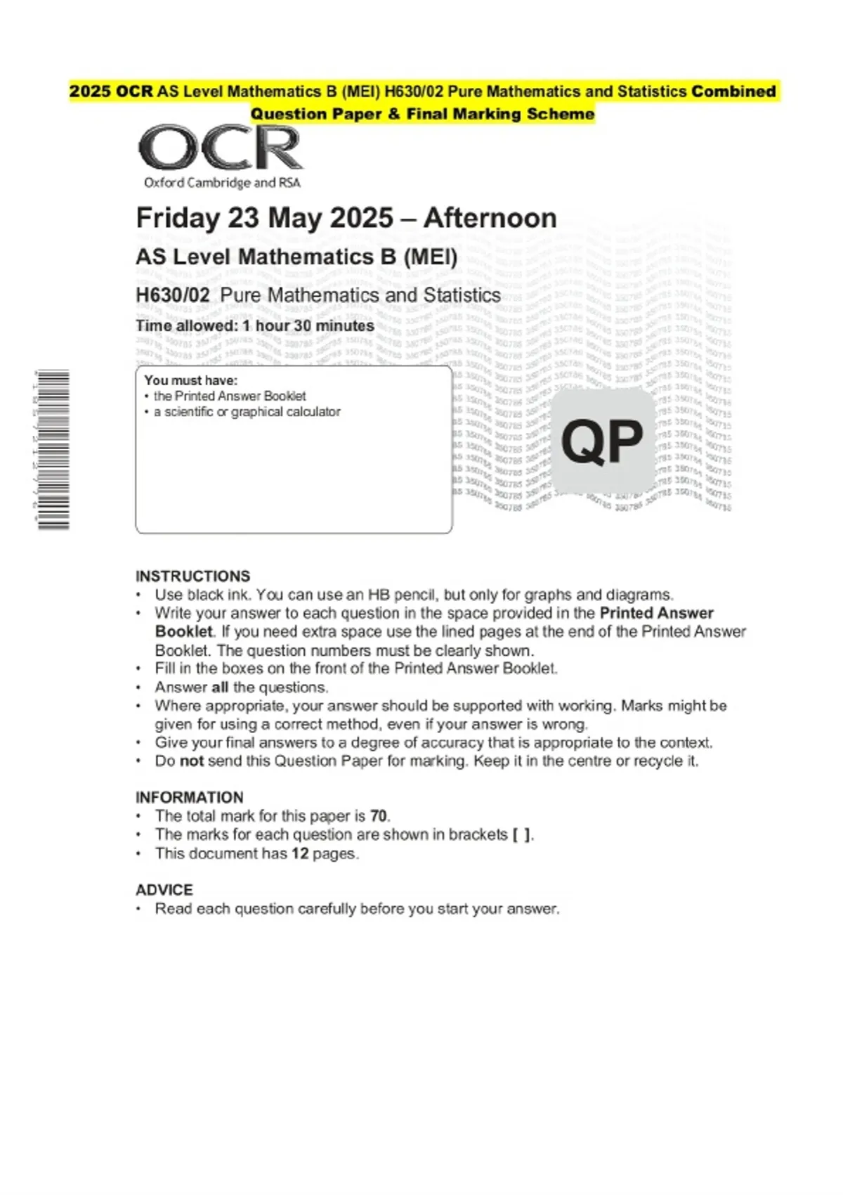 2025 OCR AS Level Mathematics B (MEI) H630/02 Pure Mathematics and Statistics Question Paper and Final Evaluation Scheme