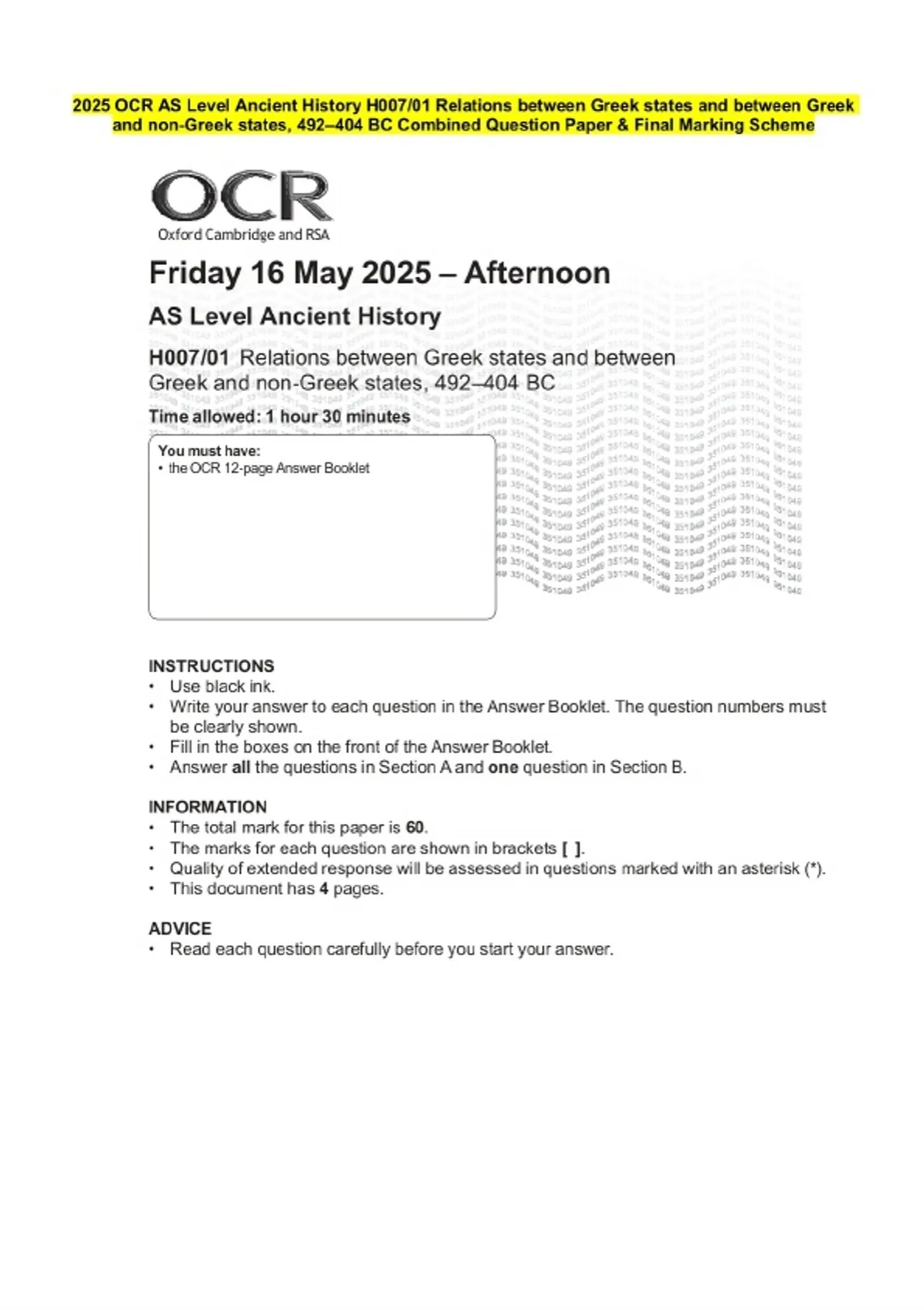 2025 OCR AS Level Ancient History H007/01 Relations between Greek states and between Greek and non-Greek states, 492–404 BC Combined Exam paper along with marking scheme