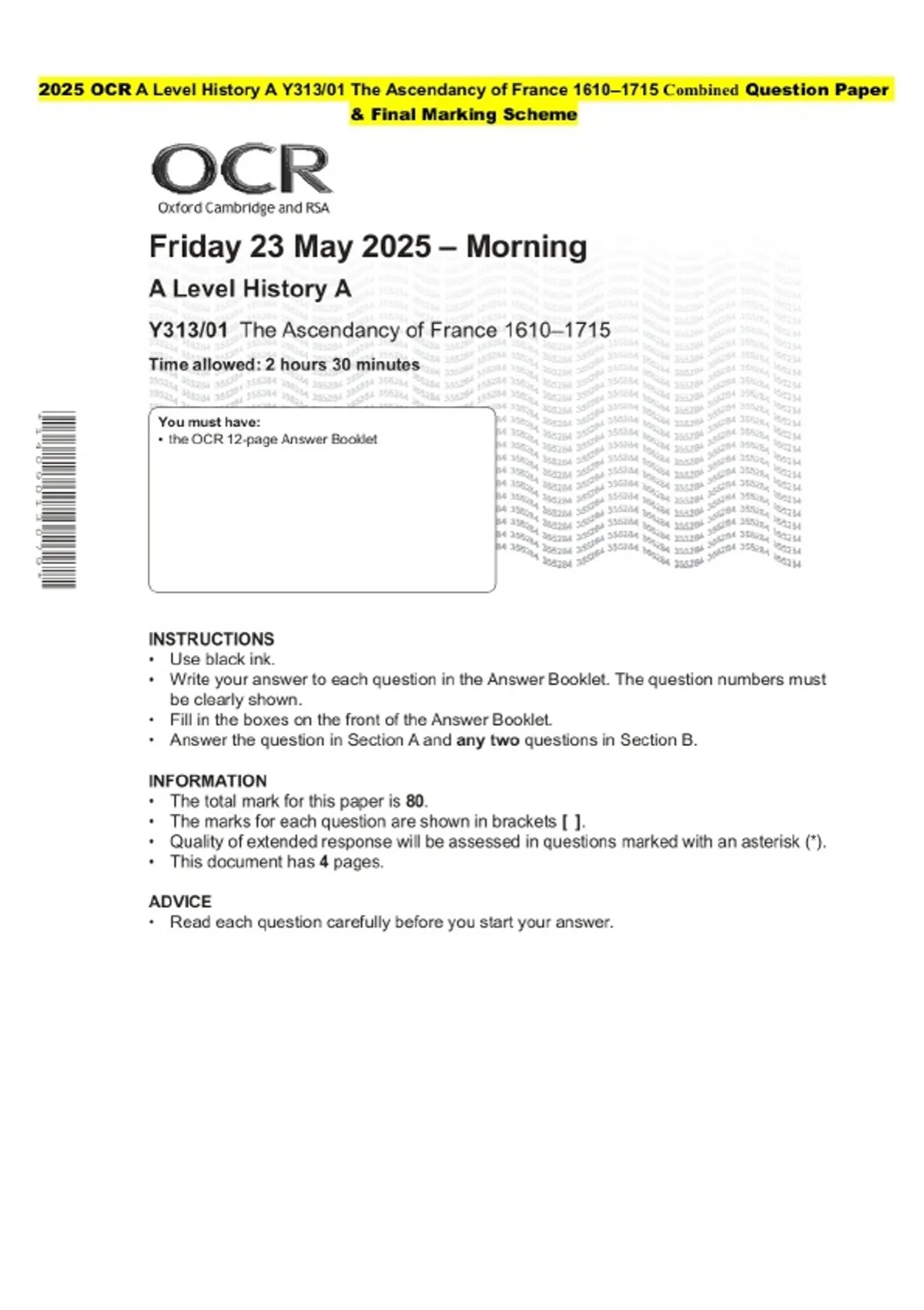 2025 OCR A Level History A Y313/01 The Ascendancy of France 1610–1715 Combined Exam paper along with marking scheme
