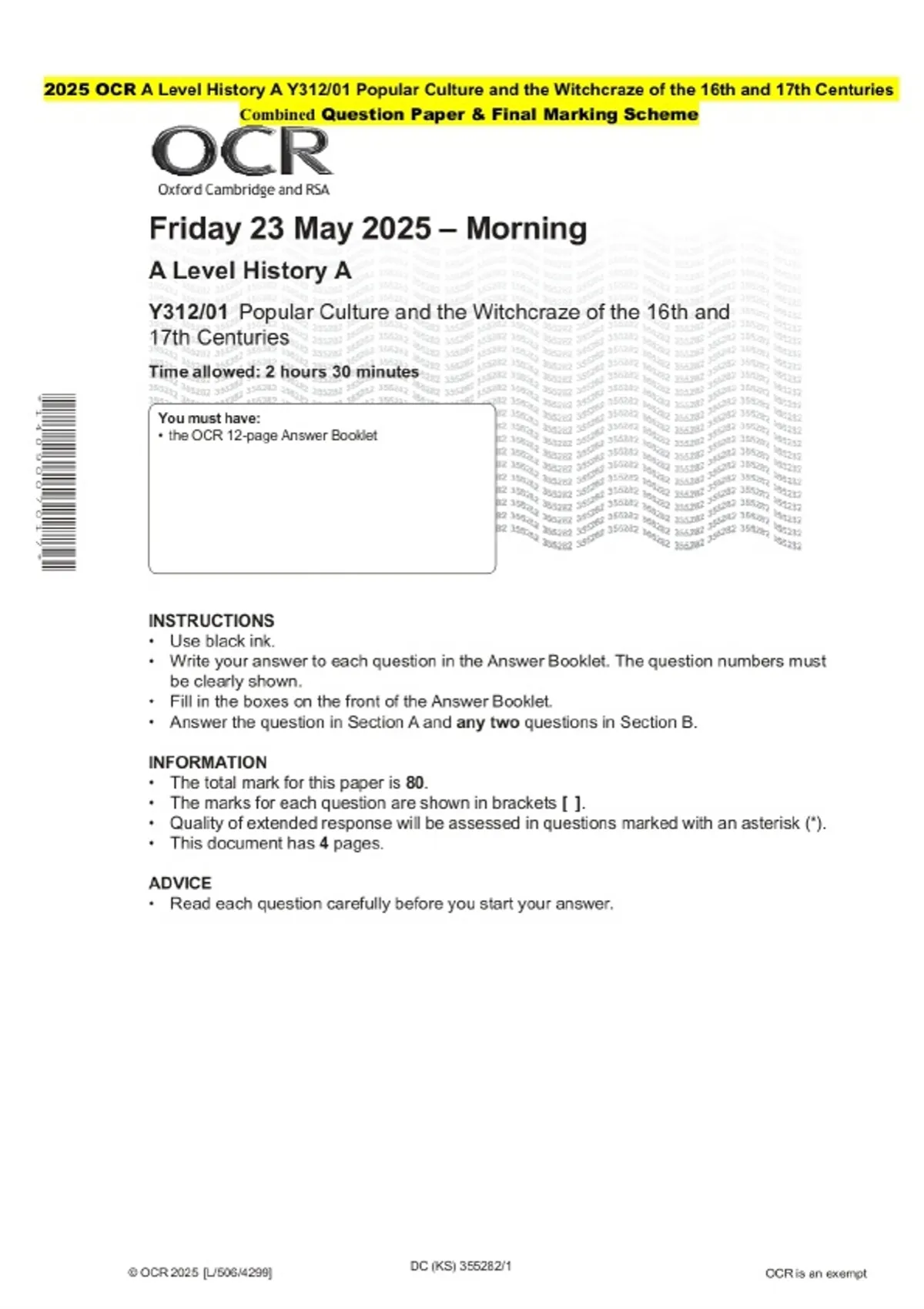 2025 OCR A Level History A Y312/01 Popular Culture and the Witchcraze of the 16th and 17th Centuries Combined Exam paper along with marking scheme