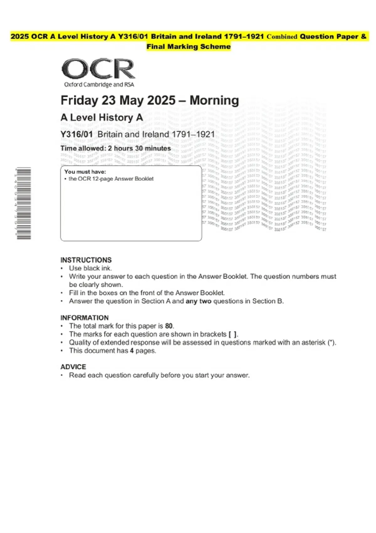2025 OCR A Level History A Y316/01 Britain and Ireland 1791–1921 Combined Exam paper along with marking scheme