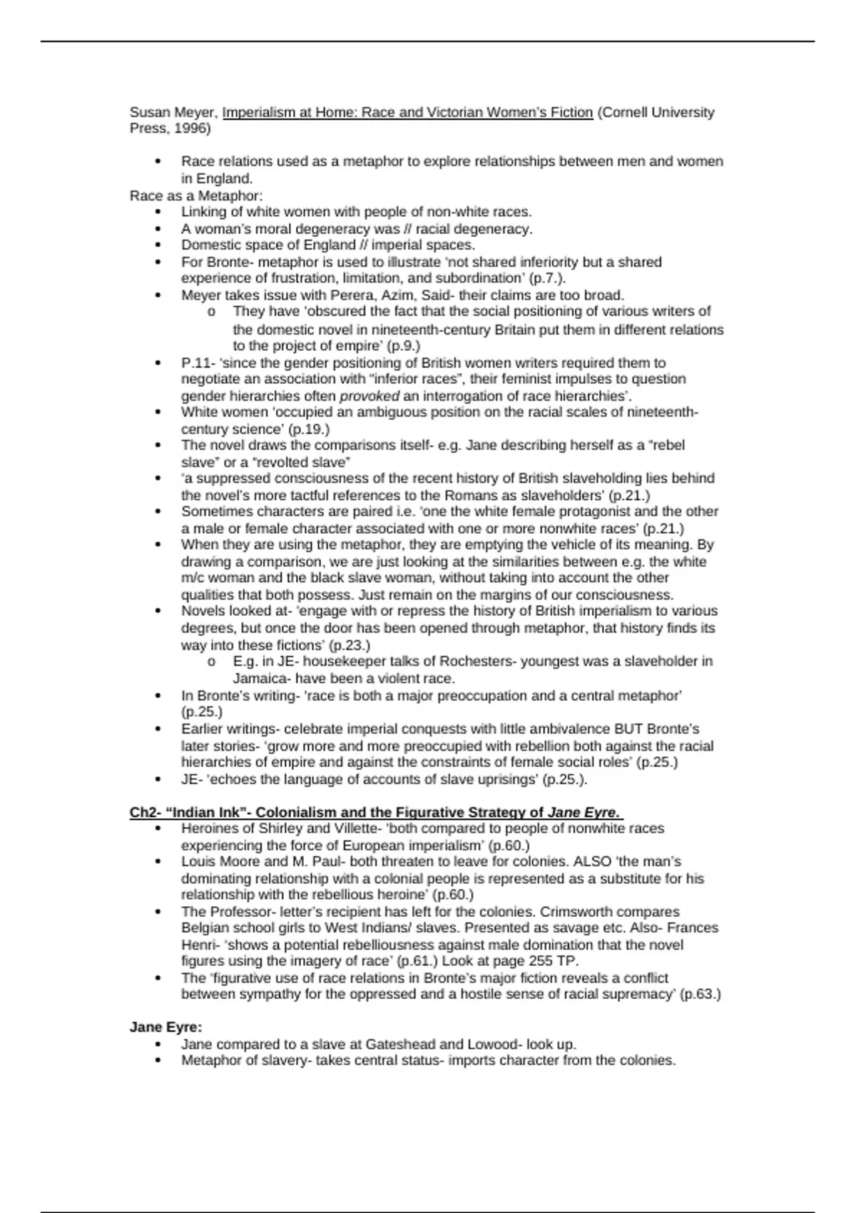 Covers the following: - race relations and relations between men and women - domestic and imperial spaces - shared frustrations of race and feminism - gender and race hierarchies - Jane Eyre - Comparisons of Shirley and Villette to people of non-white races - Class, race and gender oppression