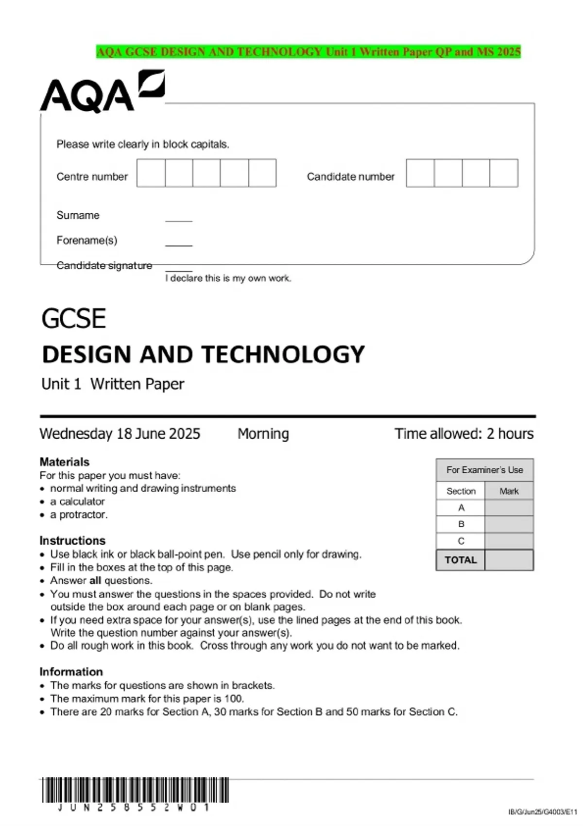 AQA GCSE DESIGN AND TECHNOLOGY Unit 1 Written Paper QP and MS 2025
