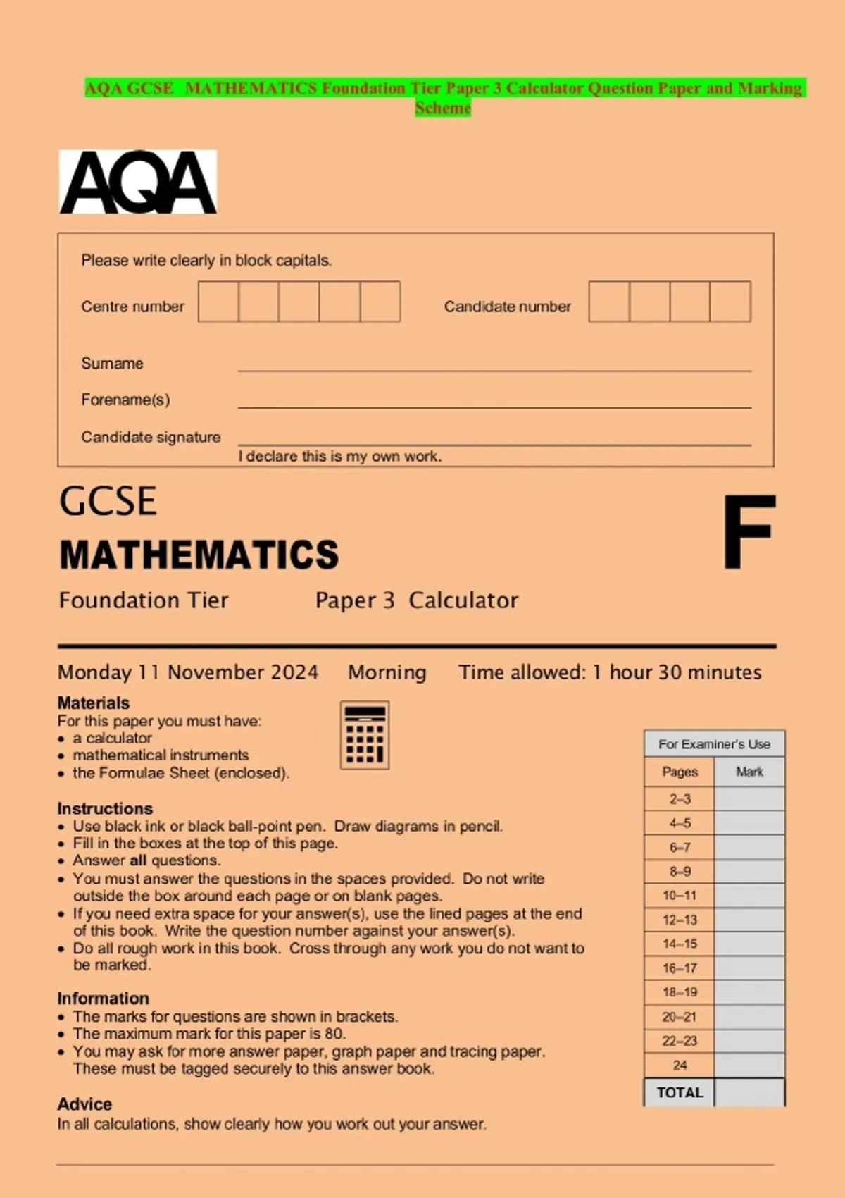 AQA GCSE MATHEMATICS Foundation Tier Paper 3 Calculator Question Paper and Marking Scheme