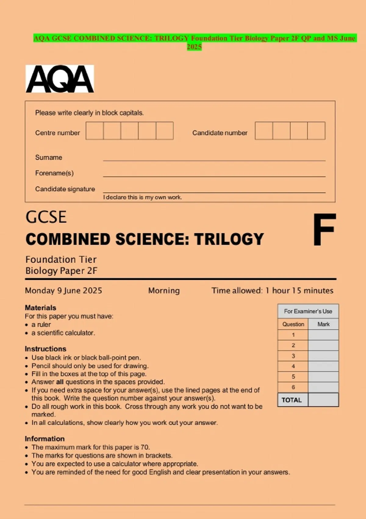 AQA GCSE COMBINED SCIENCE: TRILOGY Foundation Tier Biology Paper 2F QP and MS June 2025