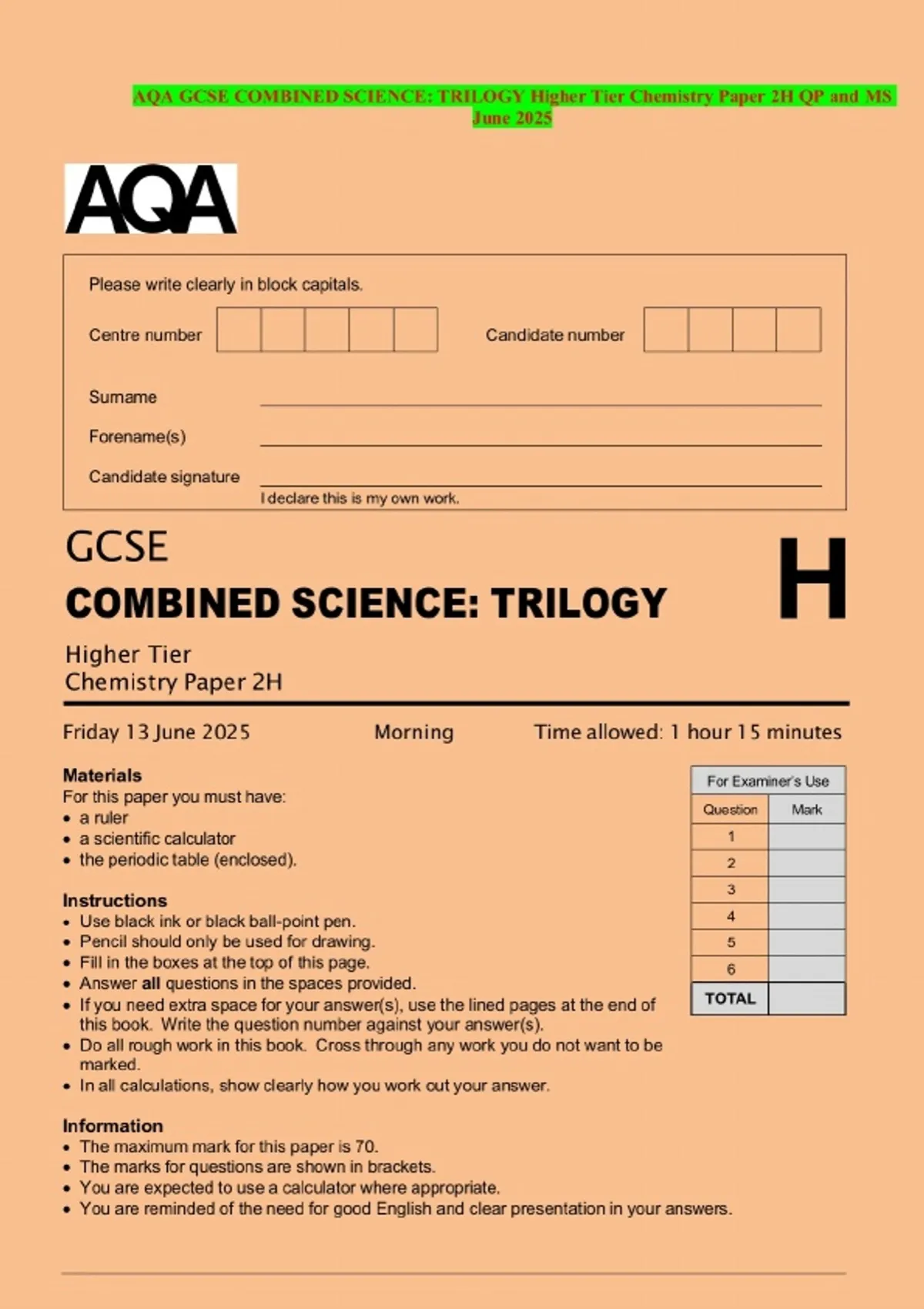 AQA GCSE COMBINED SCIENCE: TRILOGY Higher Tier Chemistry Paper 2H QP and MS June 2025