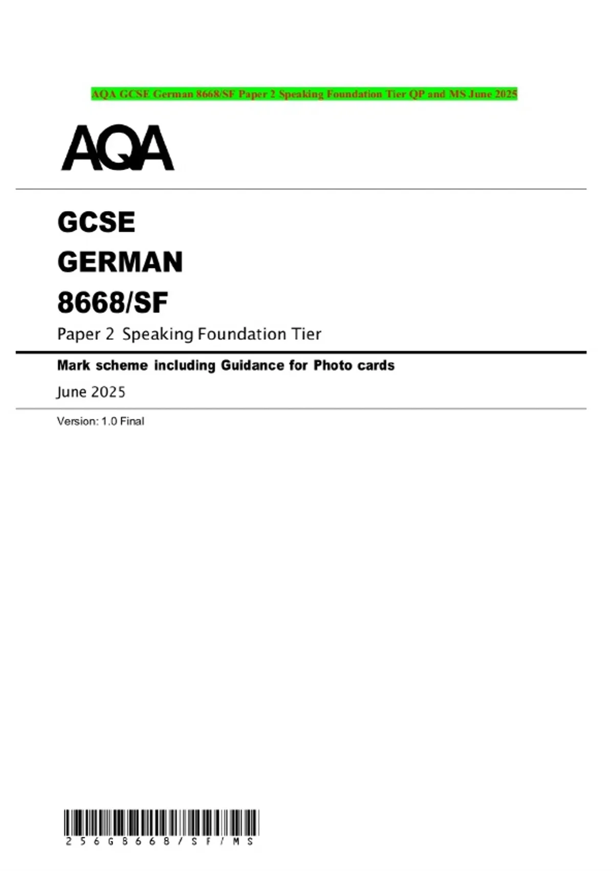 AQA GCSE German 8668/SF Paper 2 Speaking Foundation Tier QP and MS June 2025