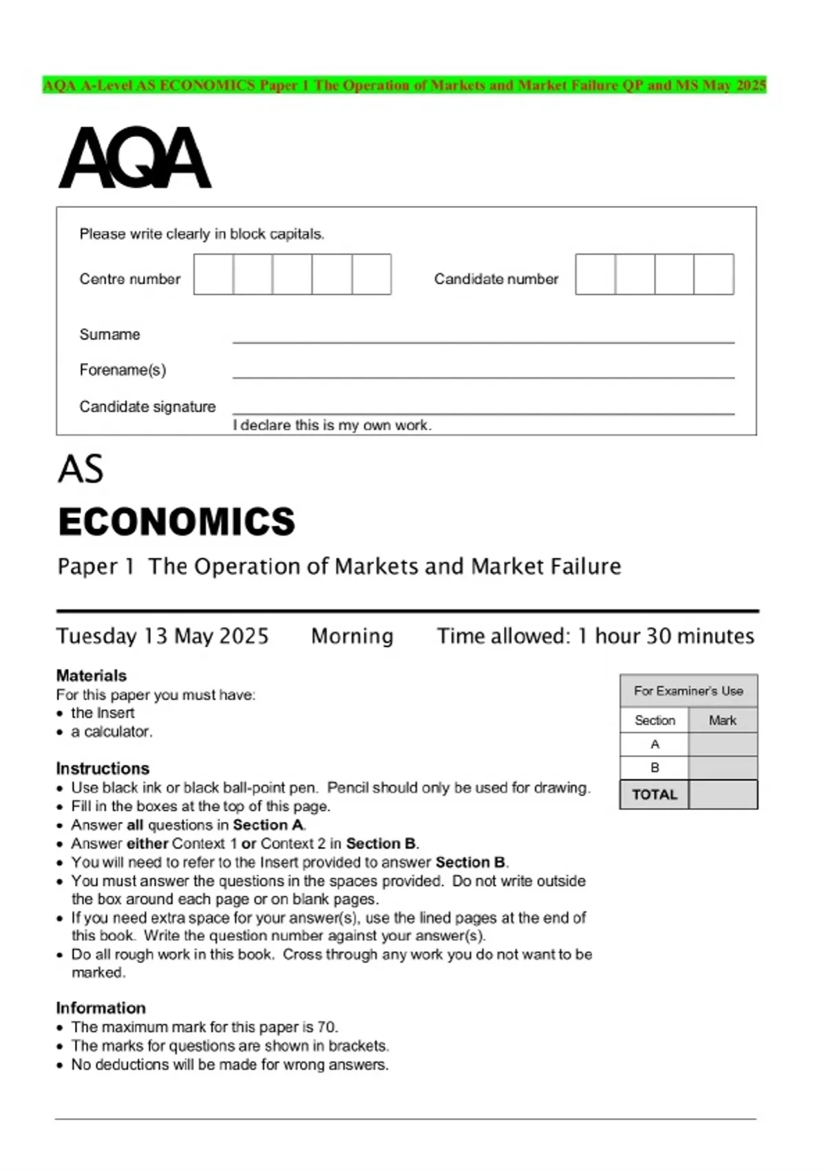 AQA A-Level AS ECONOMICS Paper 1 The Operation of Markets and Market Failure QP and MS May 2025
