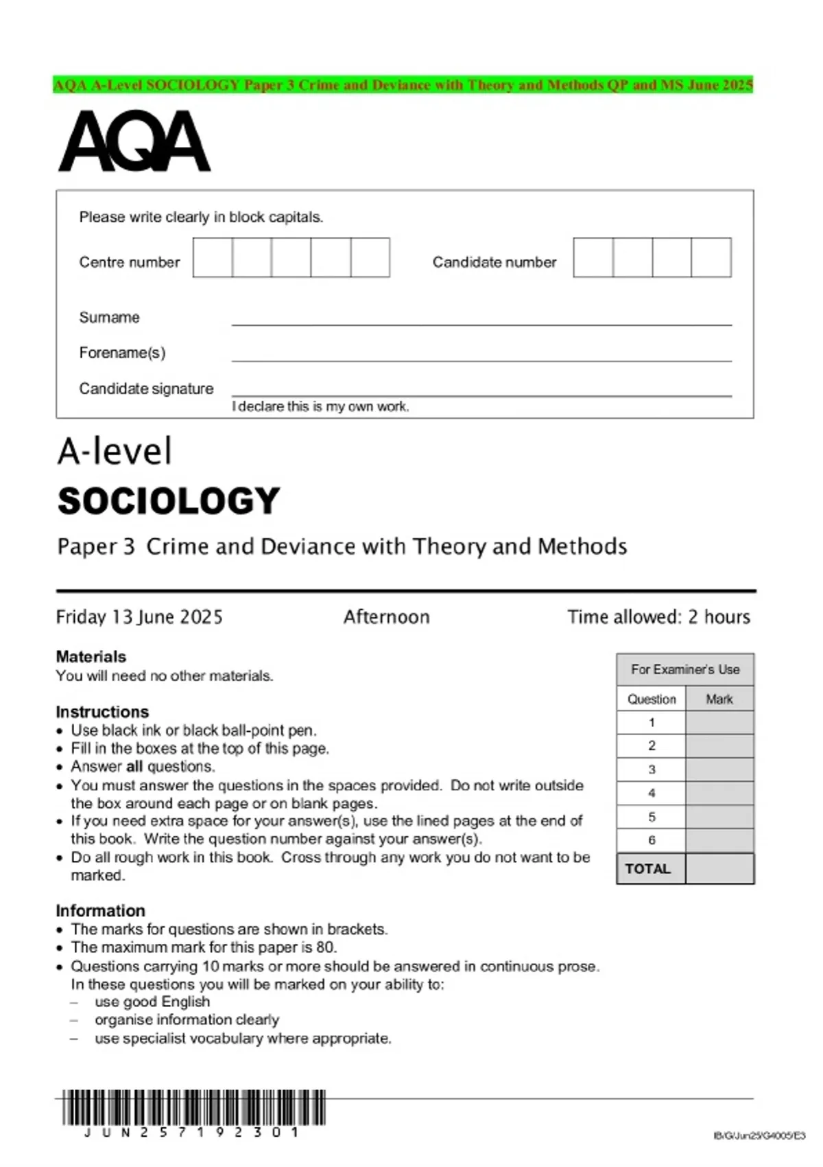 AQA A-Level SOCIOLOGY Paper 3 Crime and Deviance with Theory and Methods QP and MS June 2025