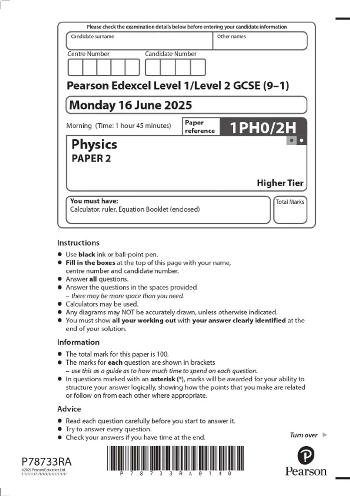 GCSE EDEXCEL 2025 PHYSICS PAPER 2H HIGHER TIER QUESTION PAPER