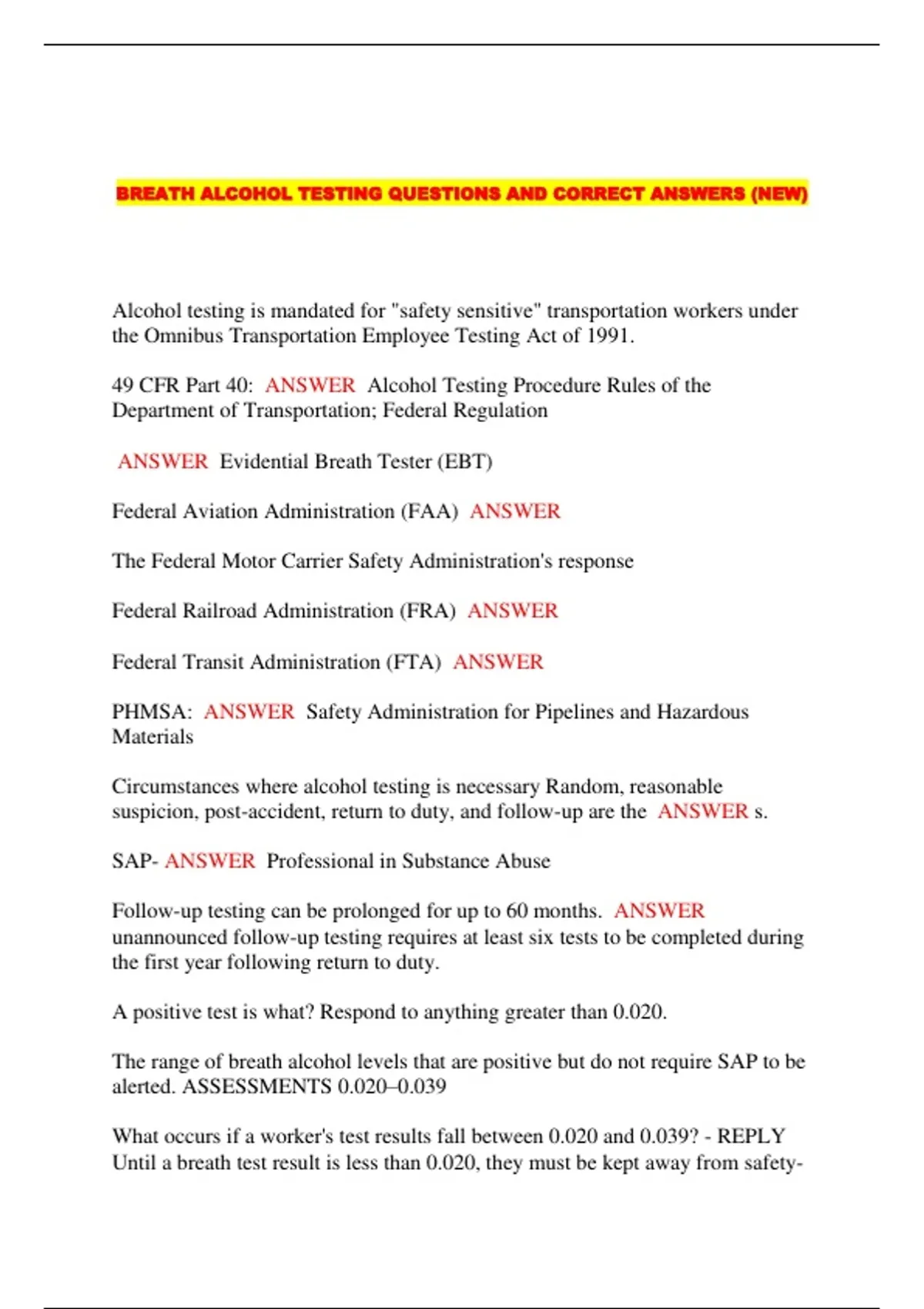 BREATH ALCOHOL TESTING QUESTIONS AND CORRECT ANSWERS (NEW)...