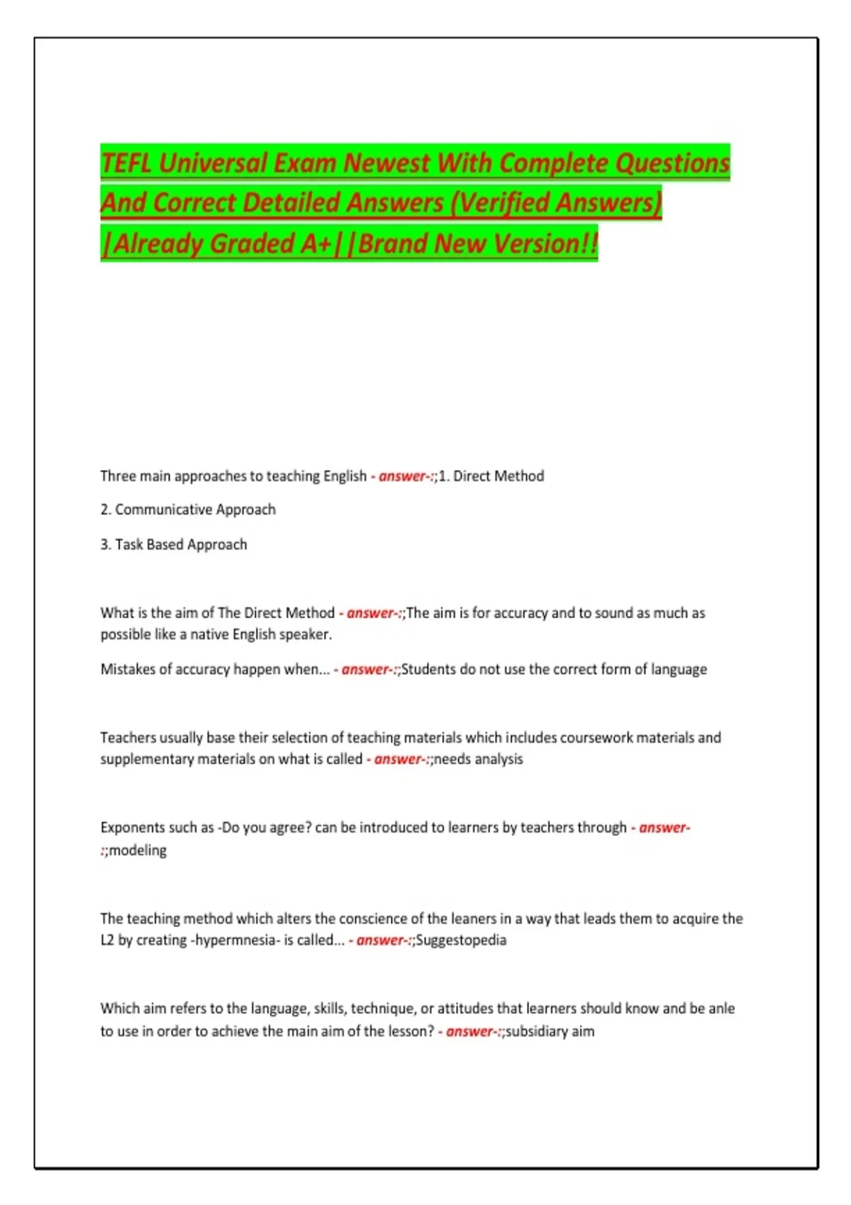 TEFL Universal Exam Newest With Complete Questions And Correct Detailed Answers (Verified Answers) |Already Graded A+||Brand New Version!!