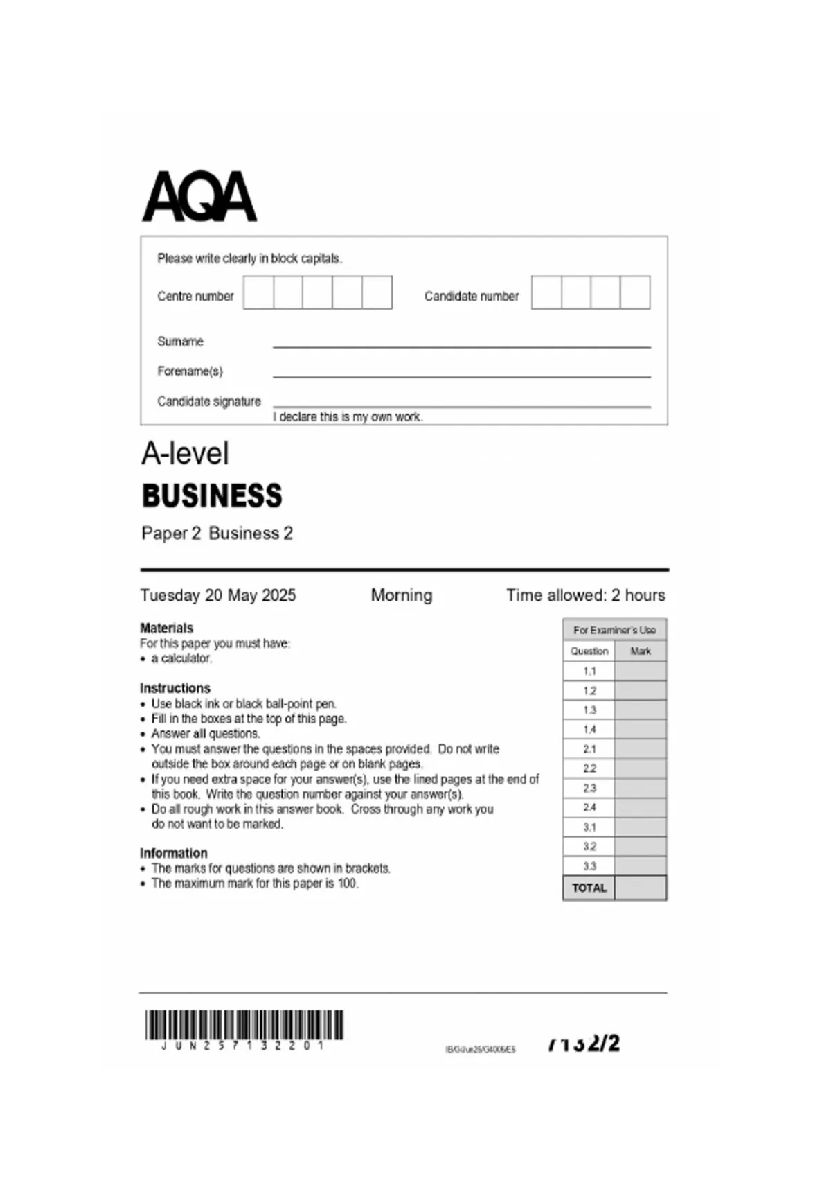 reviewed aqa a level business paper 2 2025 with mark scheme