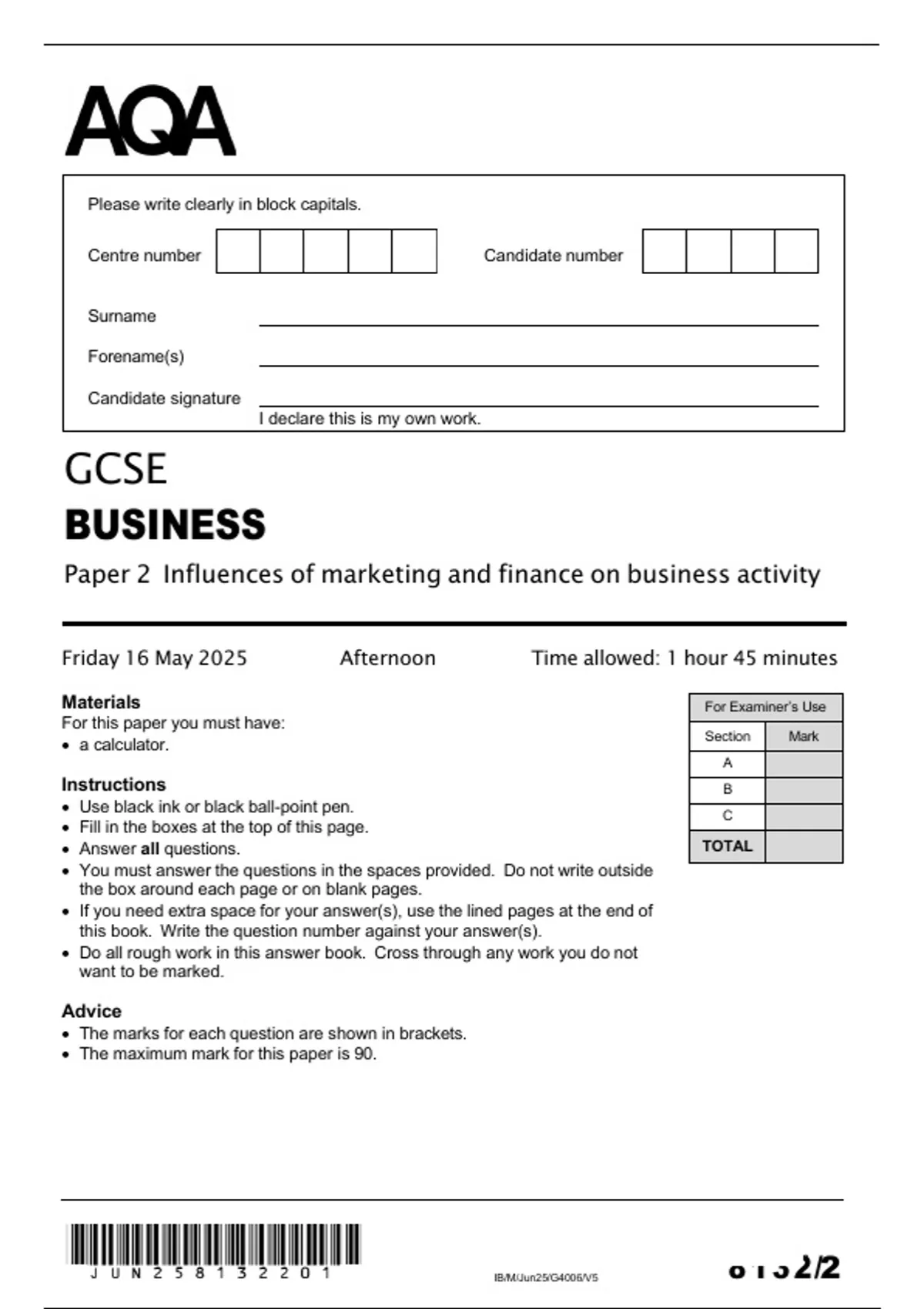 actual exam gcse aqa 2025 business paper 2 with mark scheme