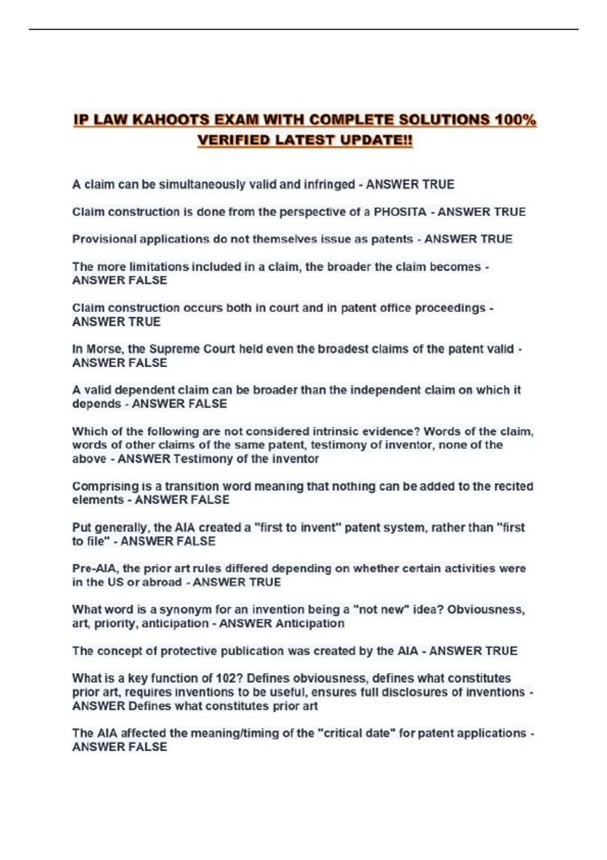 IP LAW KAHOOTS EXAM WITH COMPLETE SOLUTIONS 100% VERIFIED LATEST UPDATE!!...