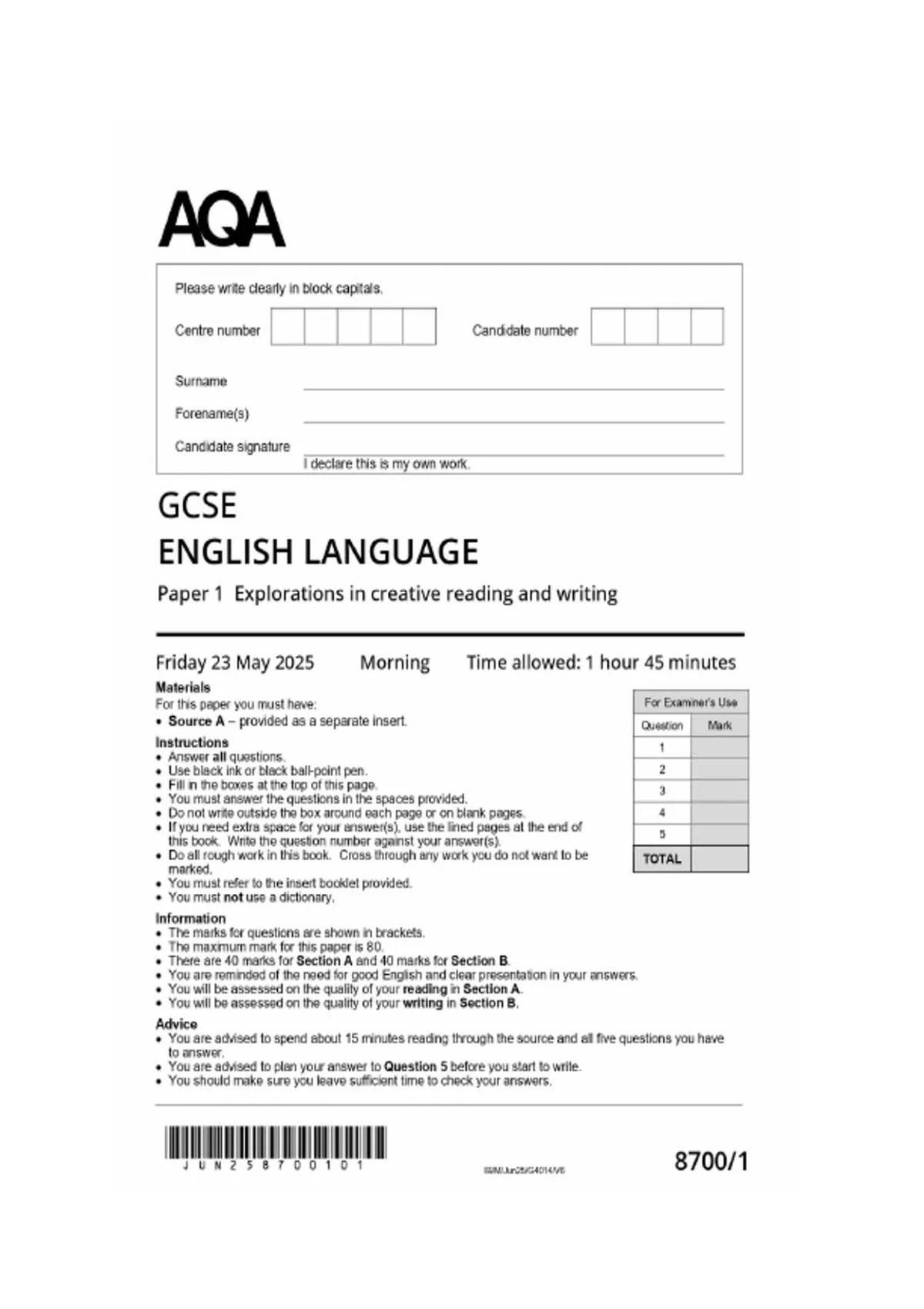 real exam gcse aqa 2025 english language paper 1 explorations in creative reading and writing