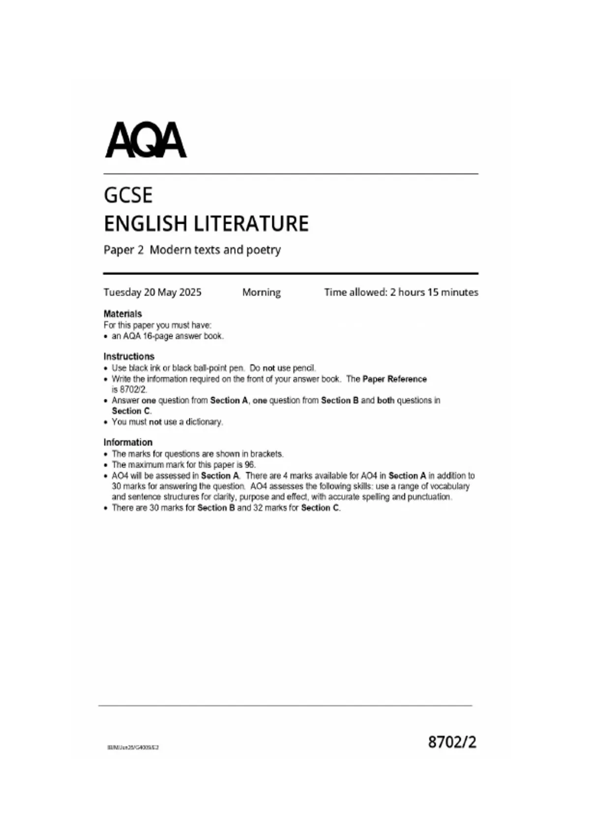 gcse aqa 2025 english literature paper 2 modern texts and poetry merged mark scheme
