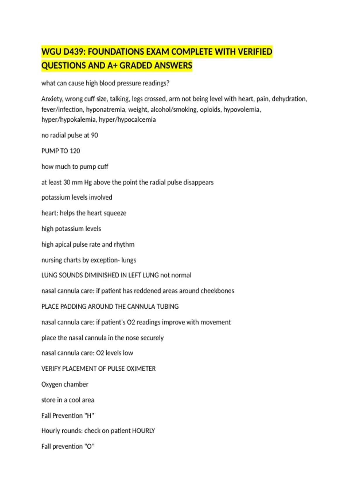 WGU D439: FOUNDATIONS EXAM COMPLETE WITH VERIFIED QUESTIONS AND A+ GRADED ANSWERS what can cause high blood pressure readings? Anxiety, wrong cuff size, talking, legs crossed, arm not being level with heart, pain, dehydration, fever/infection, hyponatremia, weight, alcohol/smoking, opioids, hypovolemia, hyper/hypokalemia, hyper/hypocalcemia no radial pulse at 90 PUMP TO 120 how much to pump cuff at least 30 mm Hg above the point the radial pulse disappears potassium levels involved heart: helps the heart squeeze high potassium levels high apical pulse rate and rhythm nursing charts by exception- lungs LUNG SOUNDS DIMINISHED IN LEFT LUNG not normal nasal cannula care: if patient has reddened areas around cheekbones PLACE PADDING AROUND THE CANNULA TUBING nasal cannula care: if patient's O2 readings improve with movement place the nasal cannula in the nose securely nasal cannula care: O2 levels low VERIFY PLACEMENT OF PULSE OXIMETER Oxygen chamber store in a cool area Fall Prevention "H" Hourly rounds: check on patient HOURLY Fall prevention "O" Organize belongings: use bed alarms Fall Prevention "P" Position changes slow: ensure slow position changes and keep everything needed within reach Fall Prevention "E"