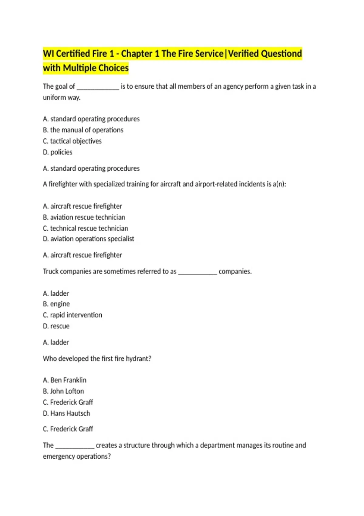 WI Certified Fire 1 - Chapter 1 The Fire Service|Verified Questiond with Multiple Choices The goal of ____________ is to ensure that all members of an agency perform a given task in a uniform way. A. standard operating procedures B. the manual of operations C. tactical objectives D. policies A. standard operating procedures A firefighter with specialized training for aircraft and airport-related incidents is a(n): A. aircraft rescue firefighter B. aviation rescue technician C. technical rescue technician D. aviation operations specialist A. aircraft rescue firefighter Truck companies are sometimes referred to as ___________ companies. A. ladder B. engine C. rapid intervention D. rescue A. ladder Who developed the first fire hydrant? A. Ben Franklin B. John Lofton C. Frederick Graff D. Hans Hautsch C. Frederick Graff The ___________ creates a structure through which a department manages its routine and emergency operations? A. Incident command system B. Division