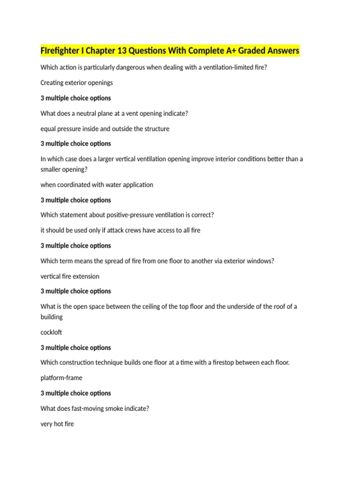 FIrefighter I Chapter 13 Questions With Complete A+ Graded Answers Which action is particularly dangerous when dealing with a ventilation-limited fire? Creating exterior openings 3 multiple choice options What does a neutral plane at a vent opening indicate? equal pressure inside and outside the structure 3 multiple choice options In which case does a larger vertical ventilation opening improve interior conditions better than a smaller opening? when coordinated with water application 3 multiple choice options Which statement about positive-pressure ventilation is correct? it should be used only if attack crews have access to all fire 3 multiple choice options Which term means the spread of fire from one floor to another via exterior windows? vertical fire extension 3 multiple choice options What is the open space between the ceiling of the top floor and the underside of the roof of a building cockloft 3 multiple choice options Which construction technique builds one floor at a time with a firestop between each floor. platform-frame 3 multiple choice options What does fast-moving smoke indicate? very hot fire 3 multiple choice options Which type of ventilation uses openings above the fire so that heat can escape the structure in an upward direction? Vertical 3 multiple choice options For