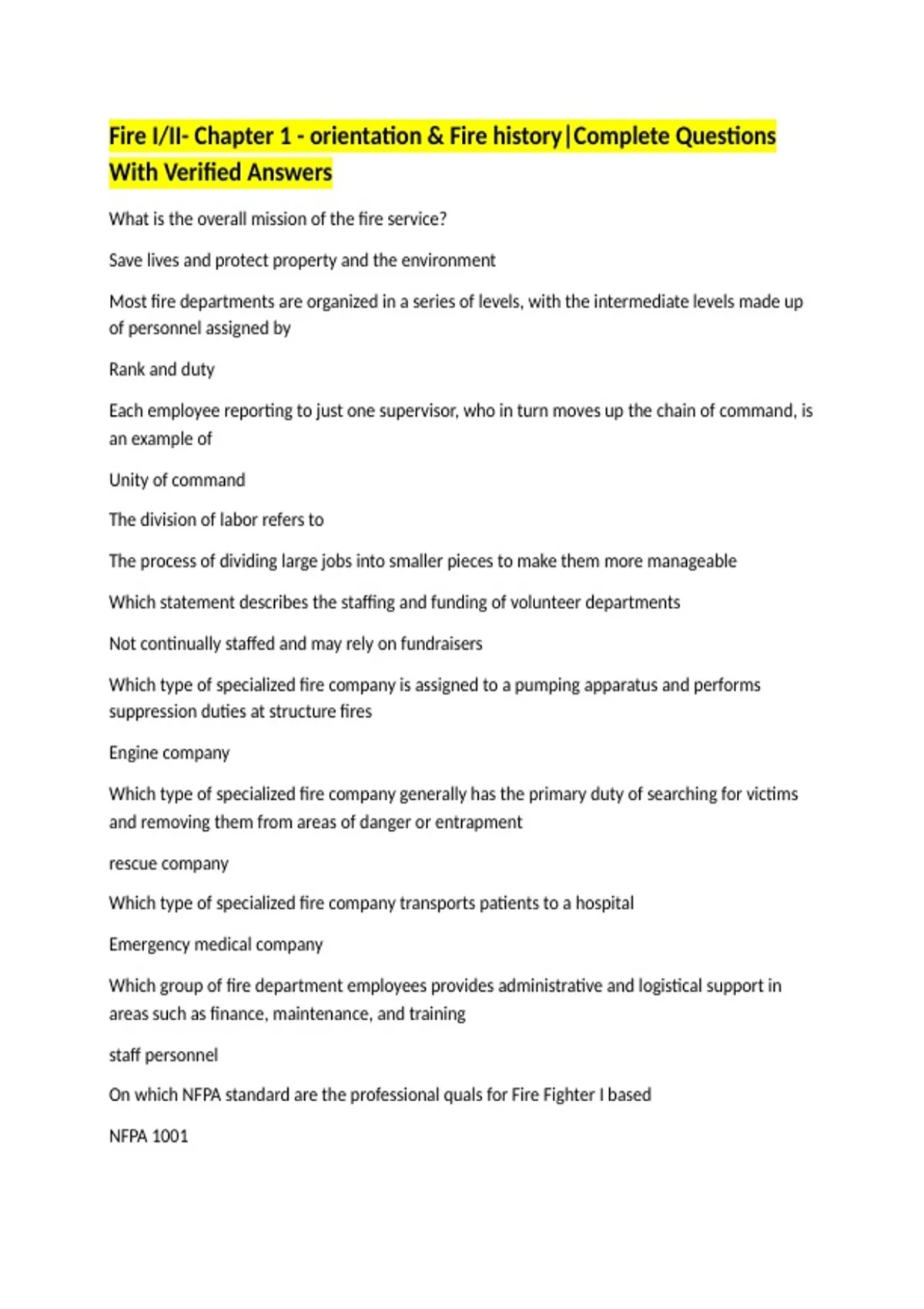 Fire I/II- Chapter 1 - orientation & Fire history|Complete Questions With Verified Answers What is the overall mission of the fire service? Save lives and protect property and the environment Most fire departments are organized in a series of levels, with the intermediate levels made up of personnel assigned by Rank and duty Each employee reporting to just one supervisor, who in turn moves up the chain of command, is an example of Unity of command The division of labor refers to The process of dividing large jobs into smaller pieces to make them more manageable Which statement describes the staffing and funding of volunteer departments Not continually staffed and may rely on fundraisers Which type of specialized fire company is assigned to a pumping apparatus and performs suppression duties at structure fires Engine company Which type of specialized fire company generally has the primary duty of searching for victims and removing them from areas of danger or entrapment rescue company Which type of specialized fire company transports patients to a hospital Emergency medical company Which group of fire department employees provides administrative and logistical support in areas such as finance, maintenance, and training staff personnel On which NFPA standard are the professional quals for Fire Fighter I based NFPA 1001 Which type of fire officer is directly in charge of monitoring operational safety at fires and other emergencies
