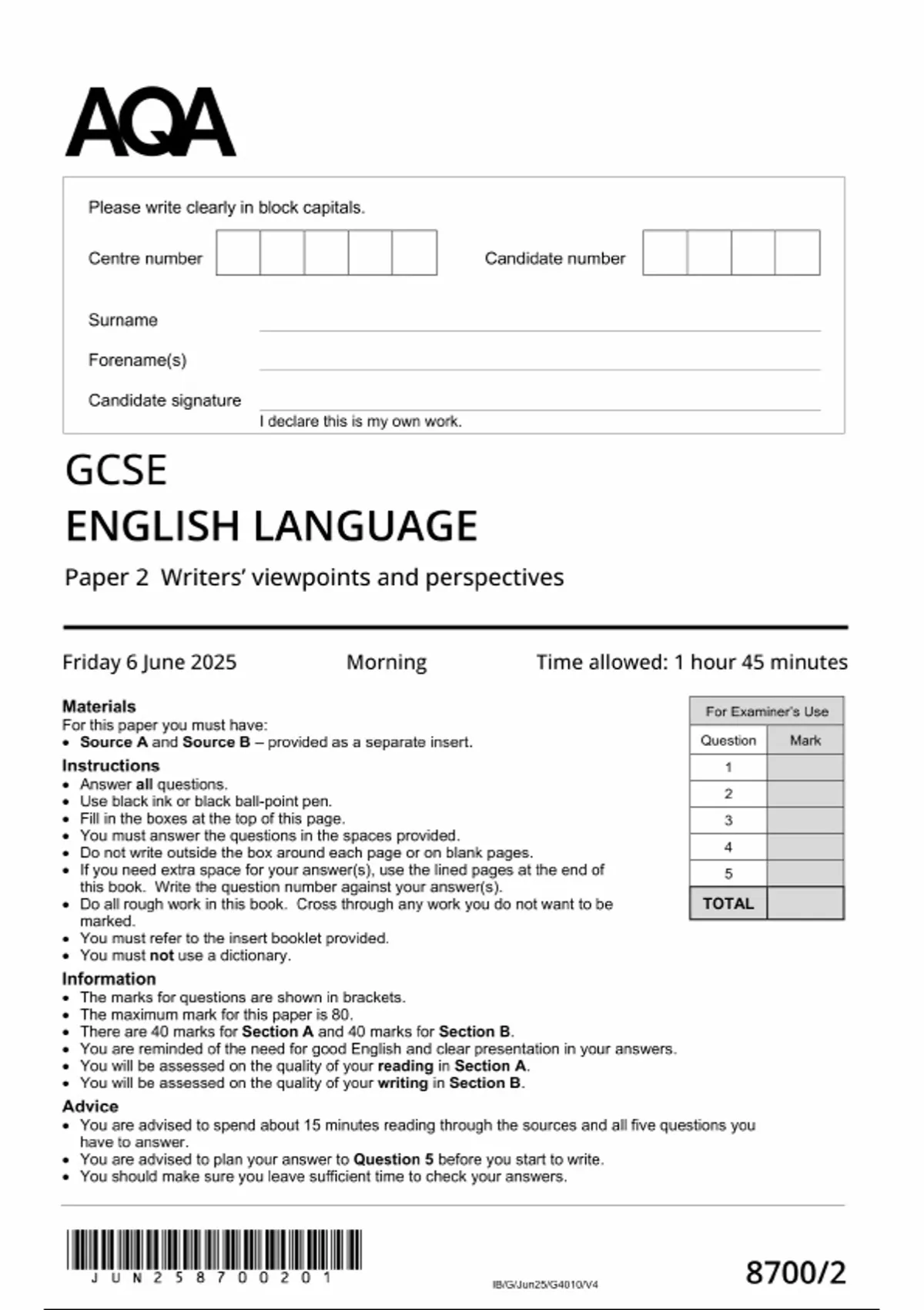 - 2025 AQA GCSE ENGLISH LANGUAGE PAPER 2