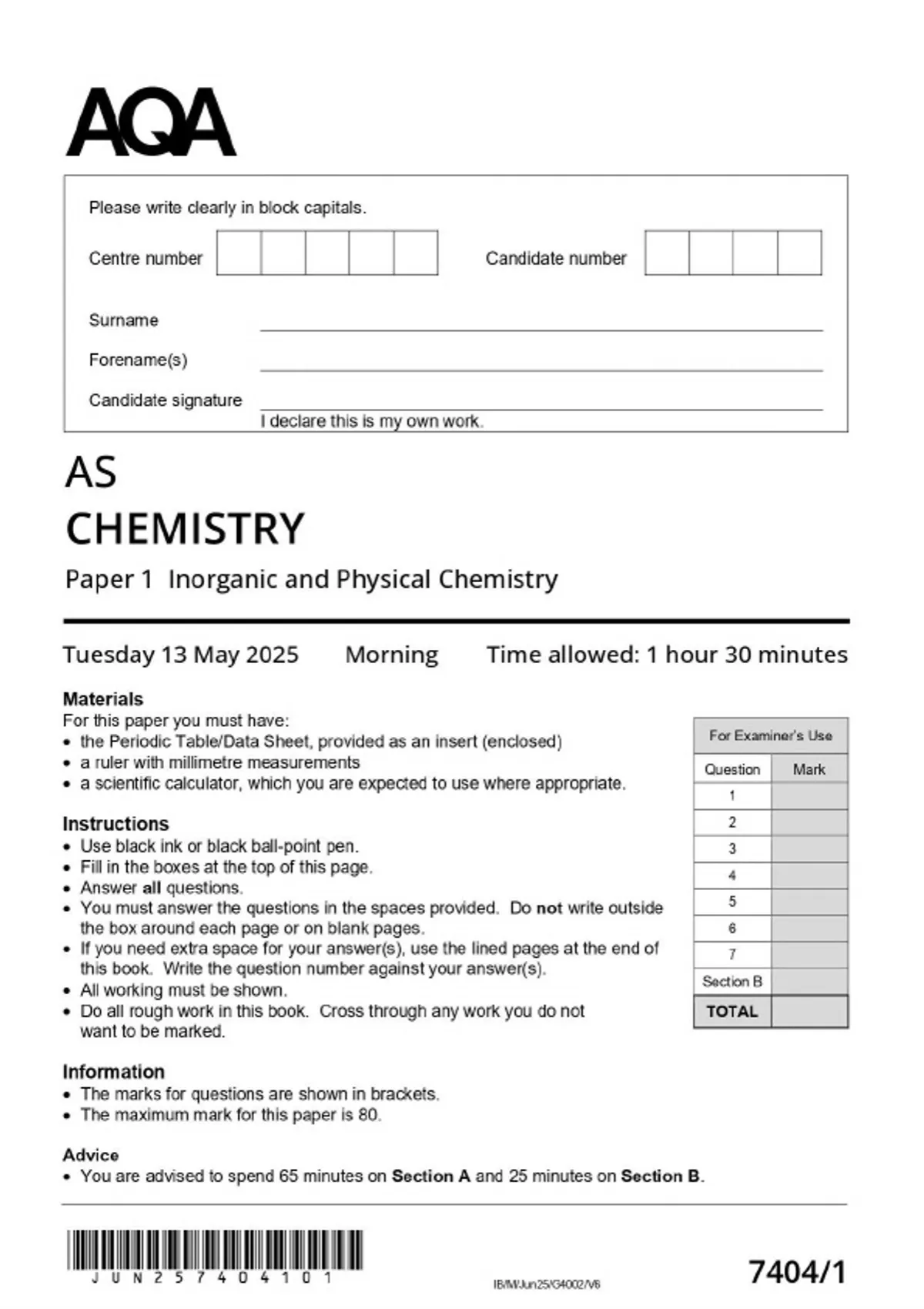 AS LEVEL AQA 2025 CHEMISTRY PAPER 1 7404-1 QUESTION PAPER AND MARK SCHEME MERGED