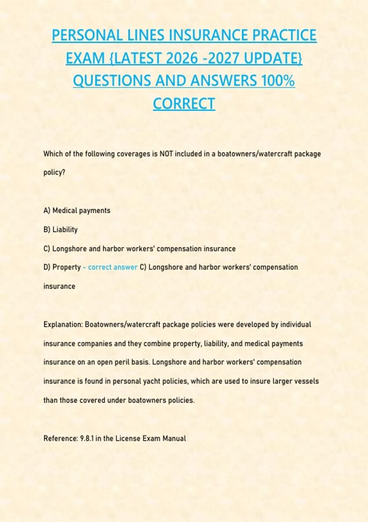 D) Property - correct answer C) Longshore and harbor workers' compensation