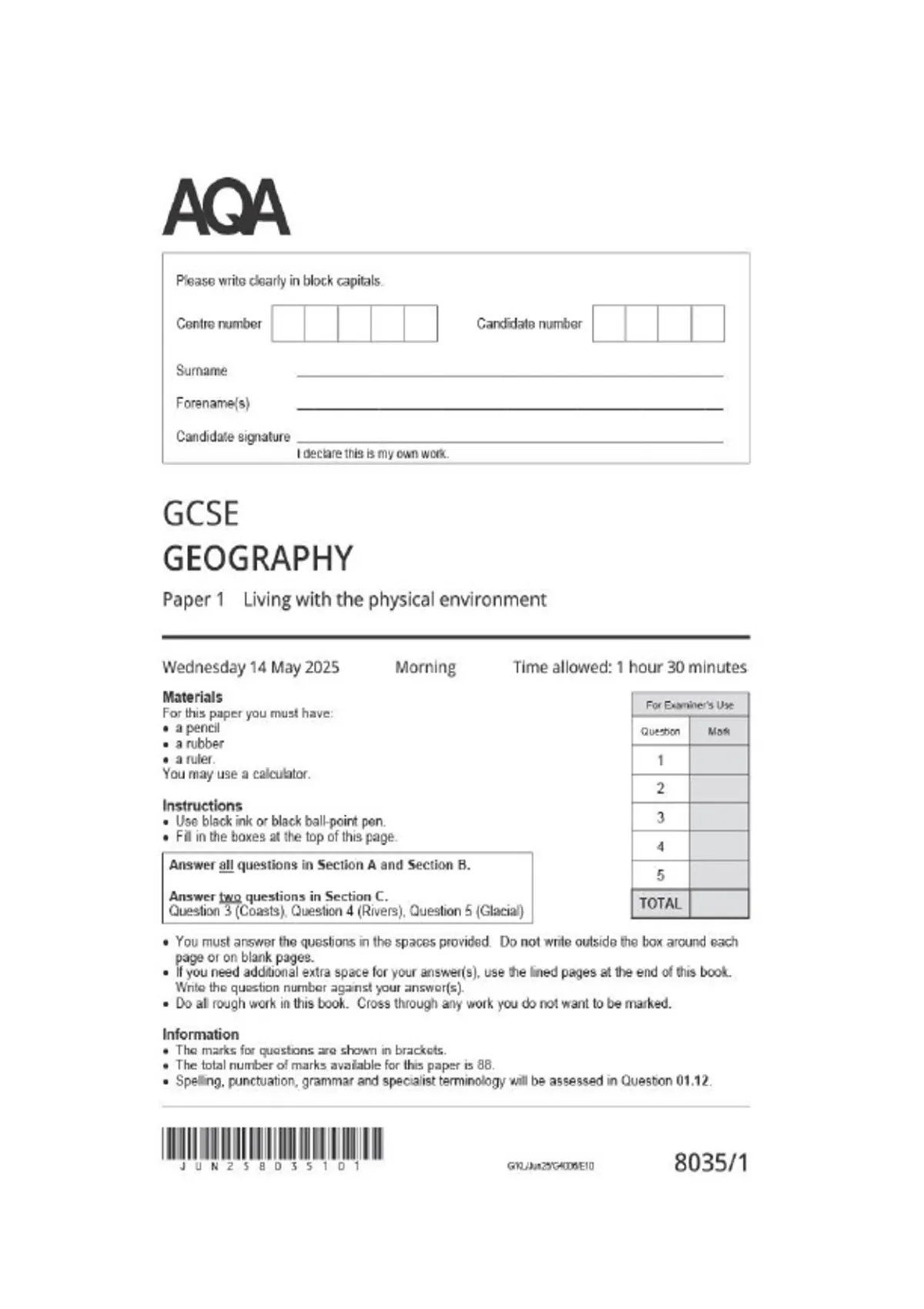 actual exam gcse aqa geography paper 1 2025 living with physical enviroment