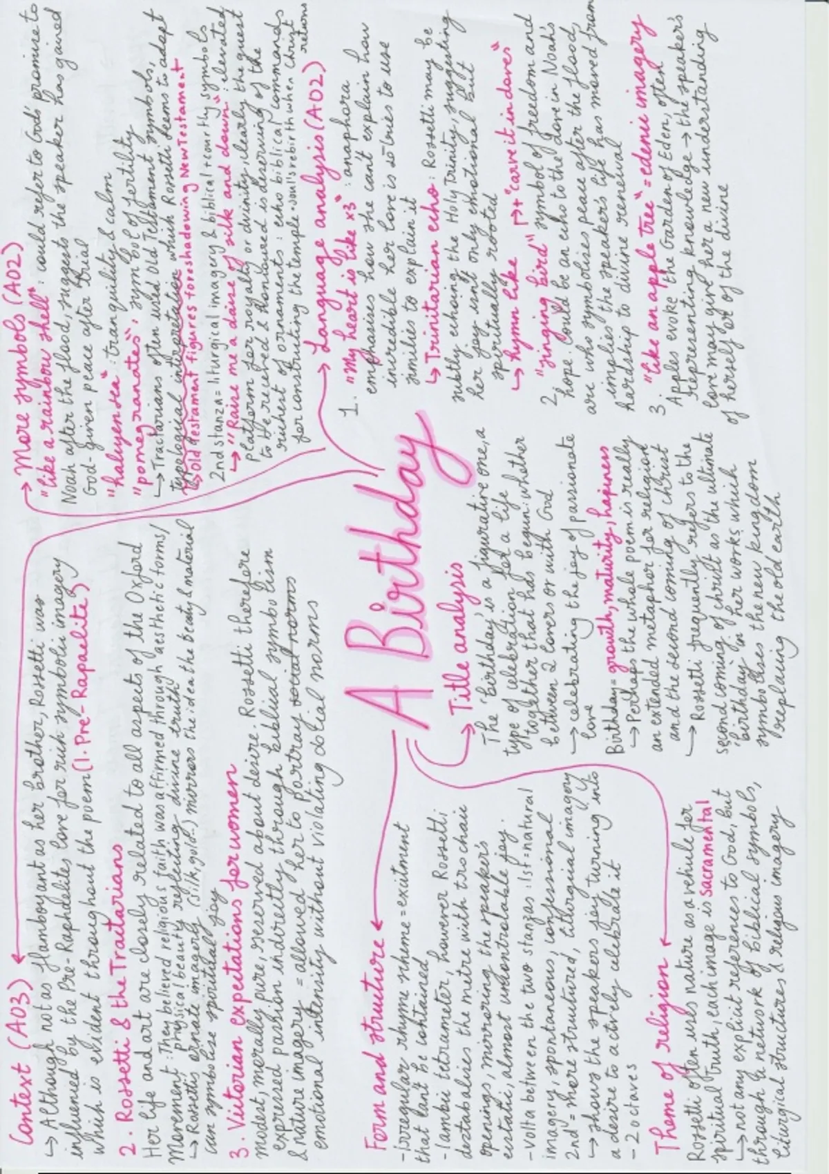 Detailed but condensed mindmap for A Birthday, including key ideas. I'm predicted an A star at A Level and use this to revise my poems Includes: - Langauge and methods analysis (AO2) - Historical context (AO3) - Thematic analysis - Title analysis - Biblical allusions - Form and structure - Symbols