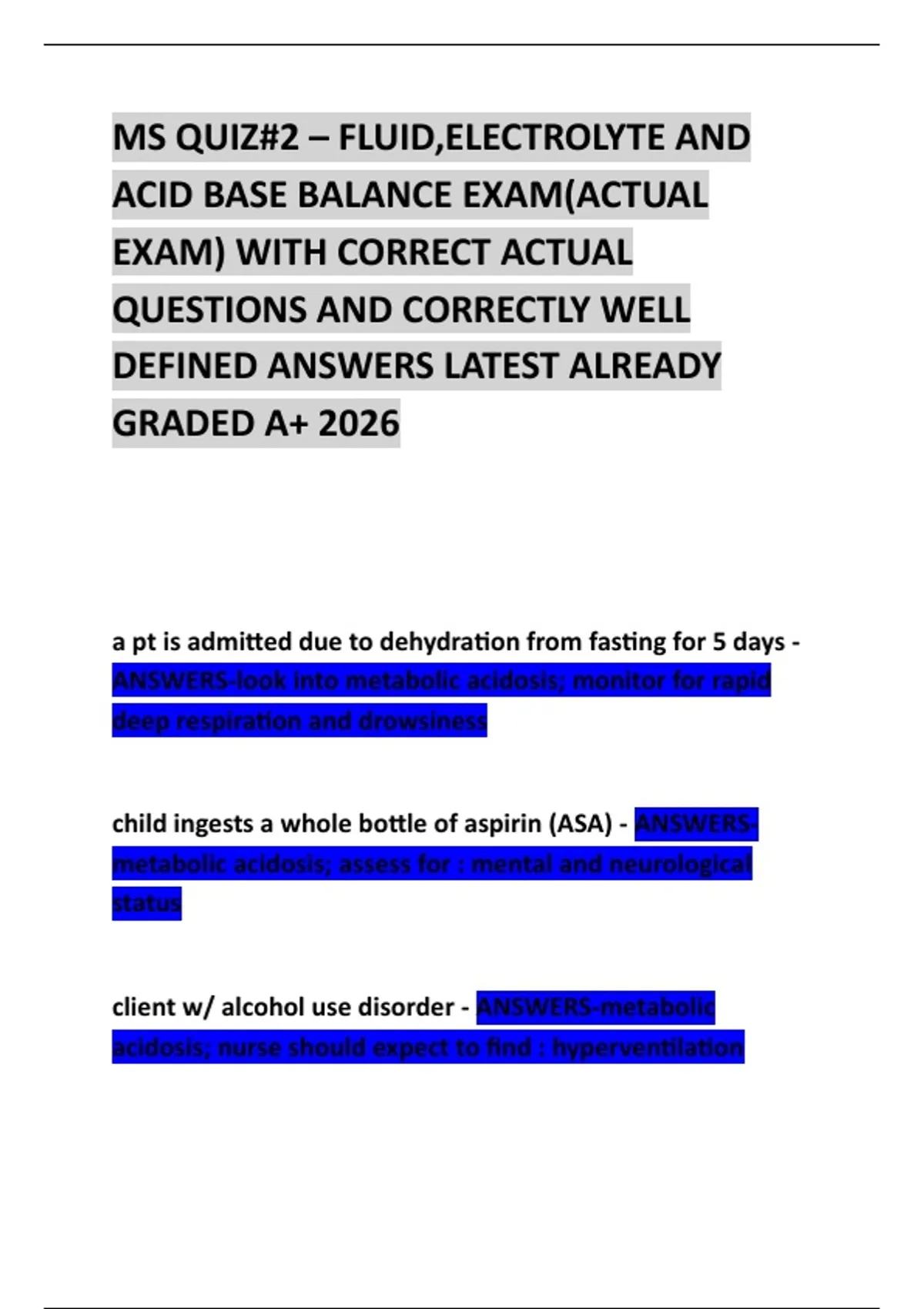 MS QUIZ#2 – FLUID,ELECTROLYTE AND ACID BASE BALANCE EXAM(ACTUAL EXAM) WITH CORRECT ACTUAL QUESTIONS AND CORRECTLY WELL DEFINED ANSWERS LATEST ALREADY GRADED A+ 2026