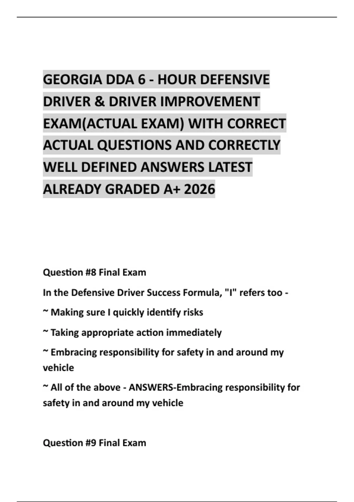 GEORGIA DDA 6 - HOUR DEFENSIVE DRIVER & DRIVER IMPROVEMENT EXAM(ACTUAL EXAM) WITH CORRECT ACTUAL QUESTIONS AND CORRECTLY WELL DEFINED ANSWERS LATEST ALREADY GRADED A+ 2026