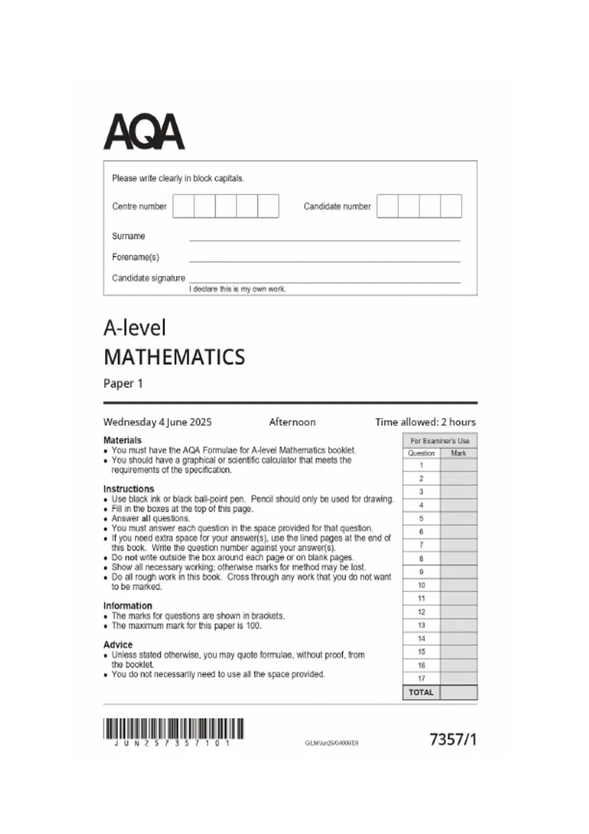 aqa a level mathematics paper 1 2025 merged with mark scheme