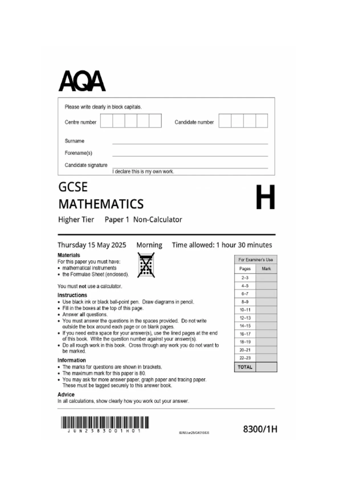 gcse aqa mathematics higher tier paper 1 2025 merged with mark scheme