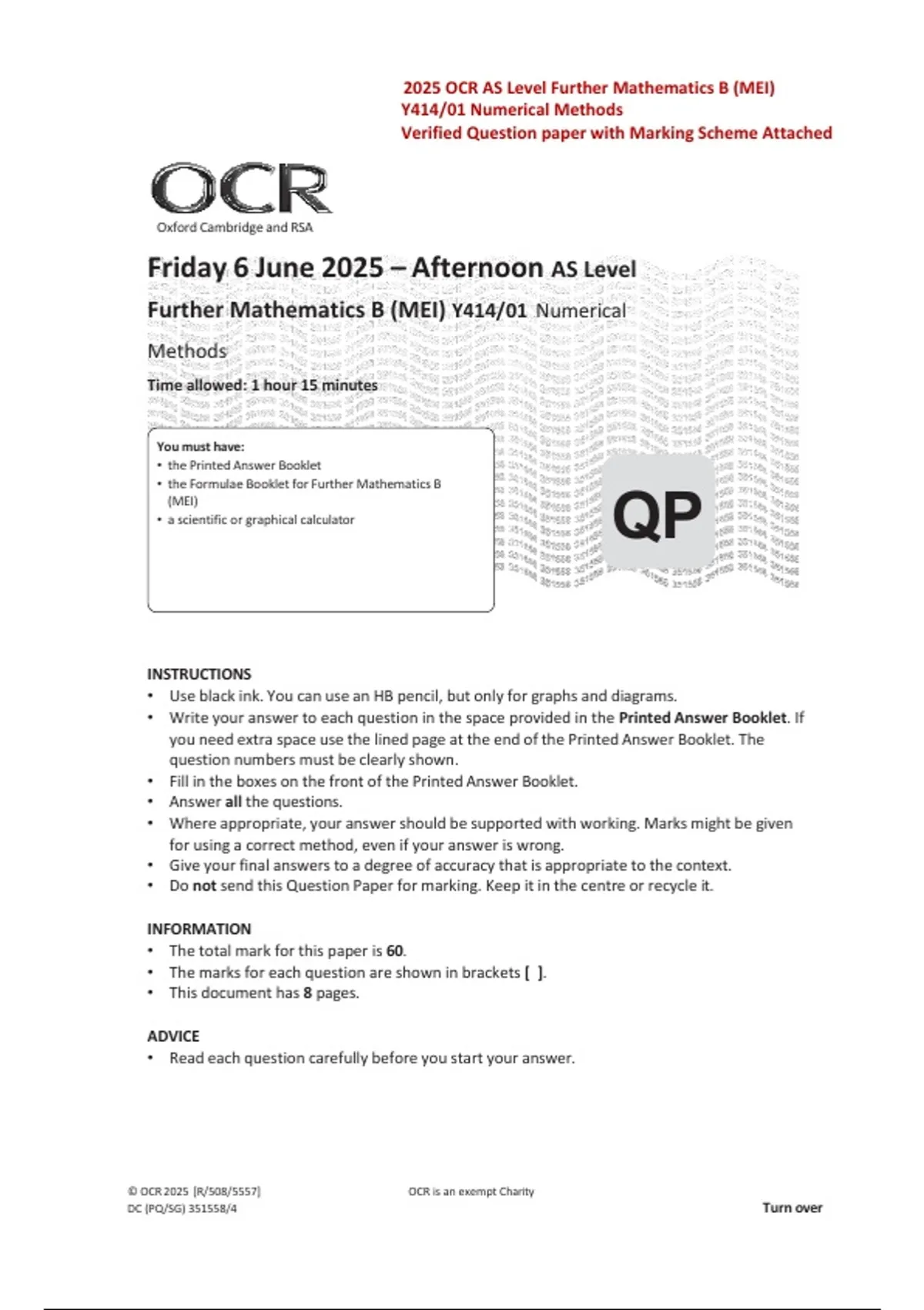 Guide.. B (MEI) Y414-01 Numerical Methods Verified Question paper with Marking Scheme Attached.p