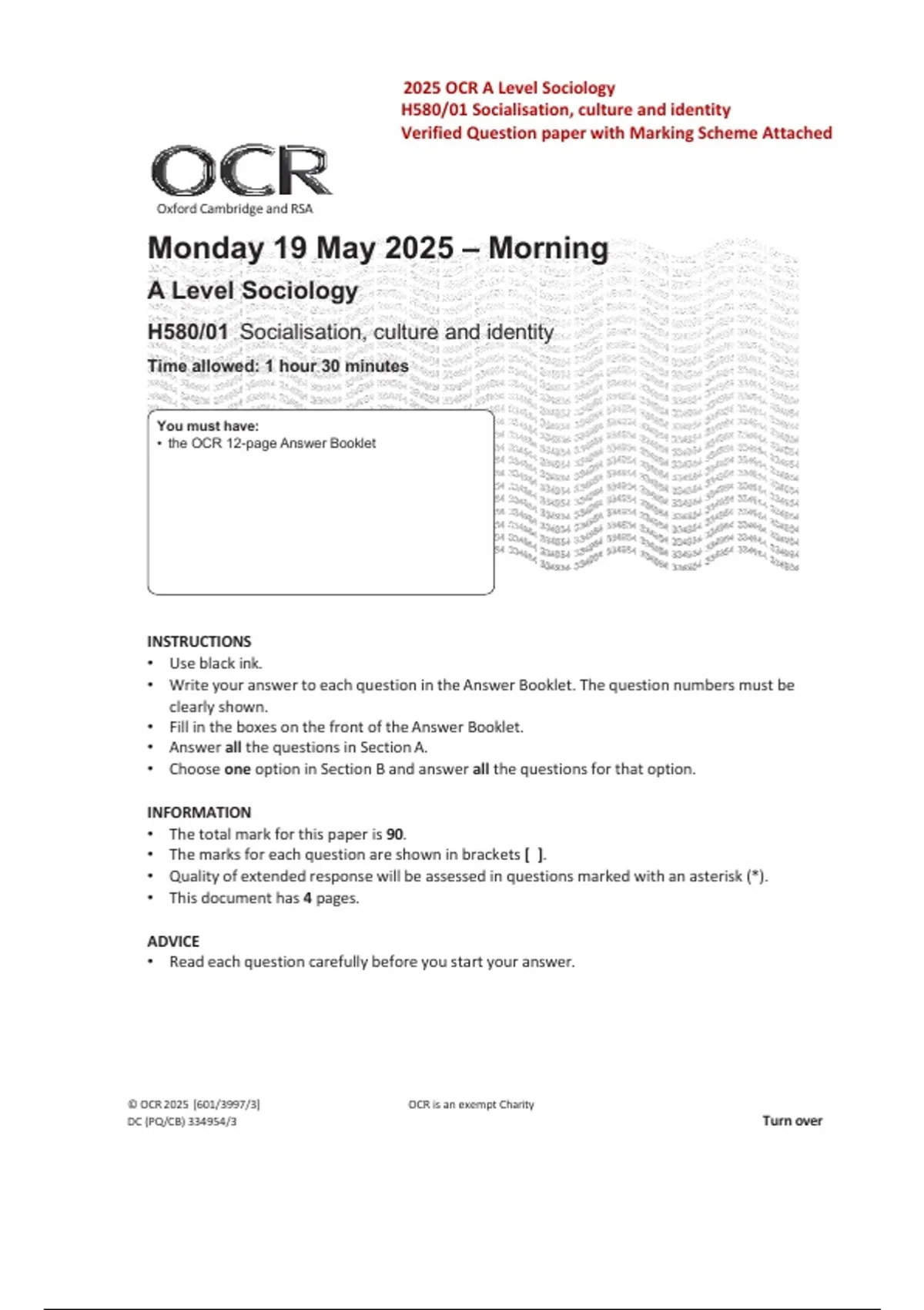 2025 OCR A Level Sociology H580/01 Socialisation, Culture and Identity | Real Exam Format Question Paper with Marking Scheme
