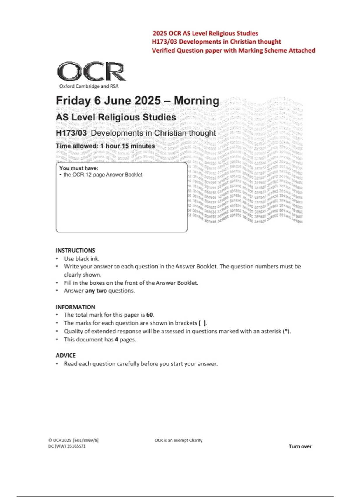 Download the 2025 OCR AS Level Religious Studies H173/03 Developments in Christian Thought question paper presented in real exam format, complete with the full marking scheme attached. This high-quality exam resource is ideal for AS Level Religious Studies students, teachers, tutors, and independent learners preparing for mock exams, internal assessments, and final revision. Designed to reflect authentic OCR exam structure and assessment objectives, it supports effective exam practice across key areas of Christian beliefs, theology, ethics, biblical interpretation, and modern developments in Christian thought. The included marking scheme helps learners understand examiner expectations, strengthen evaluative and analytical writing, and refine exam technique. Clearly formatted and easy to use, this is a reliable, time-saving study resource for confident OCR AS Level Religious Studies preparation and strong academic performance.