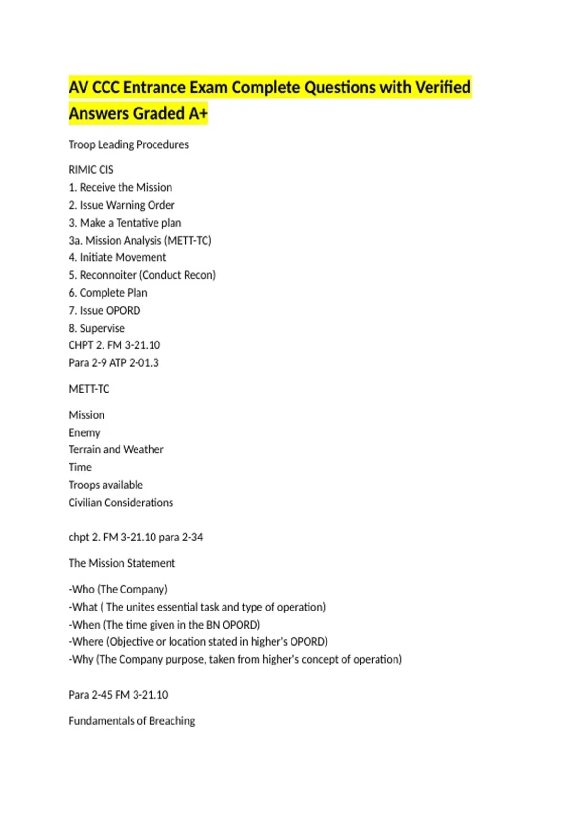 AV CCC Entrance Exam Complete Questions with Verified Answers Graded A+ Troop Leading Procedures RIMIC CIS 1. Receive the Mission 2. Issue Warning Order 3. Make a Tentative plan 3a. Mission Analysis (METT-TC) 4. Initiate Movement 5. Reconnoiter (Conduct Recon) 6. Complete Plan 7. Issue OPORD 8. Supervise CHPT 2. FM 3-21.10 Para 2-9 ATP 2-01.3 METT-TC Mission Enemy Terrain and Weather Time Troops available Civilian Considerations chpt 2. FM 3-21.10 para 2-34 The Mission Statement -Who (The Company) -What ( The unites essential task and type of operation) -When (The time given in the BN OPORD) -Where (Objective or location stated in higher's OPORD) -Why (The Company purpose, taken from higher's concept of operation) Para 2-45 FM 3-21.10 Fundamentals of Breaching 1. Suppress 2.