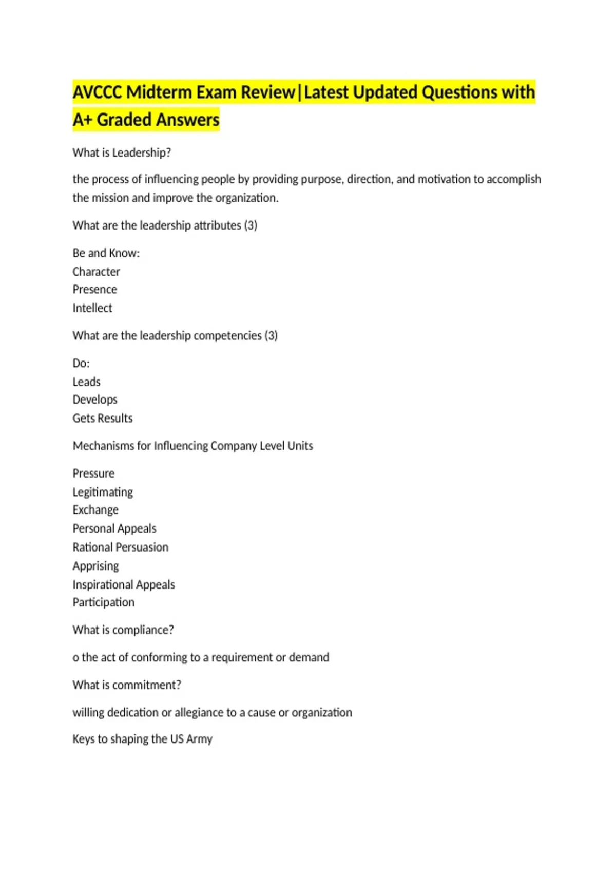 AVCCC Midterm Exam Review|Latest Updated Questions with A+ Graded Answers What is Leadership? the process of influencing people by providing purpose, direction, and motivation to accomplish the mission and improve the organization. What are the leadership attributes (3) Be and Know: Character Presence Intellect What are the leadership competencies (3) Do: Leads Develops Gets Results Mechanisms for Influencing Company Level Units Pressure Legitimating Exchange Personal Appeals Rational Persuasion Apprising Inspirational Appeals Participation What is compliance? o the act of conforming to a requirement or demand What is commitment? willing dedication or allegiance to a cause or organization Keys to shaping the US Army Share the environment Develop Shared Values Care for soldiers Keys to getting results