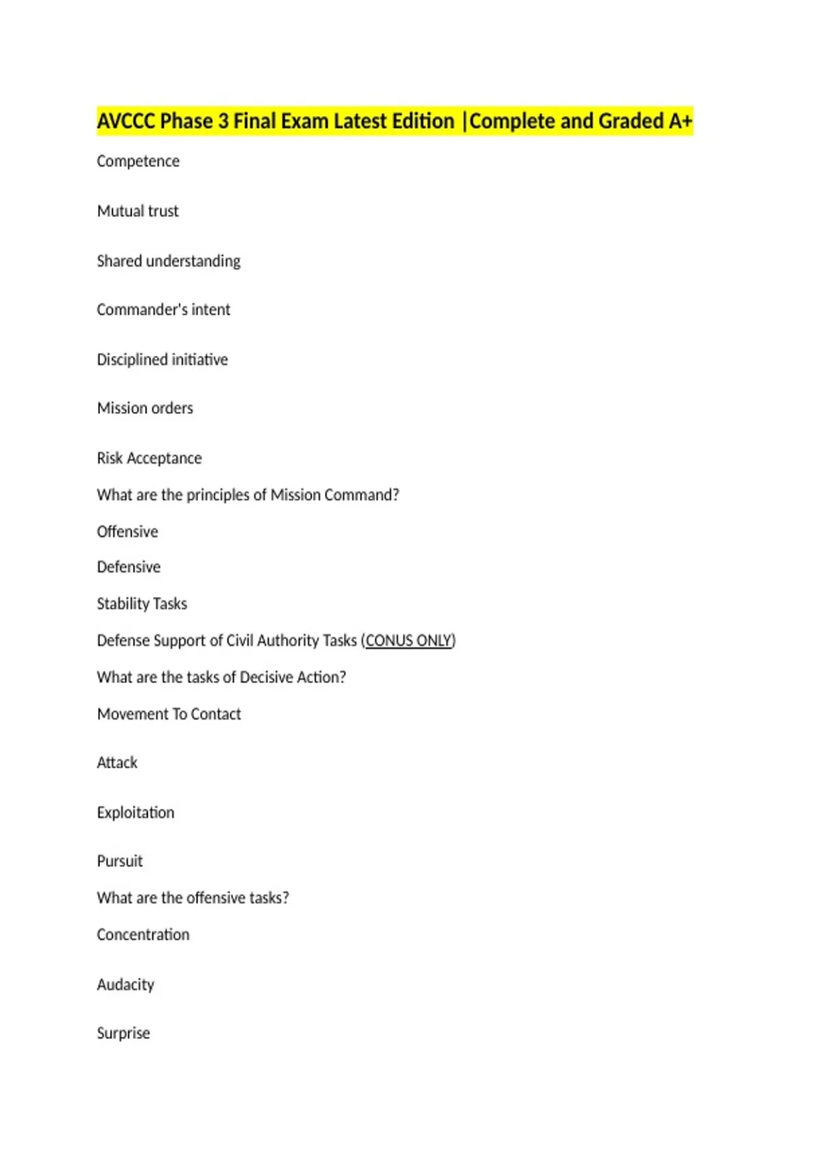AVCCC Phase 3 Final Exam Latest Edition |Complete and Graded A+ Competence Mutual trust Shared understanding Commander's intent Disciplined initiative Mission orders Risk Acceptance What are the principles of Mission Command? Offensive Defensive Stability Tasks Defense Support of Civil Authority Tasks (CONUS ONLY) What are the tasks of Decisive Action? Movement To Contact Attack Exploitation Pursuit What are the offensive tasks? Concentration Audacity Surprise Tempo What are
