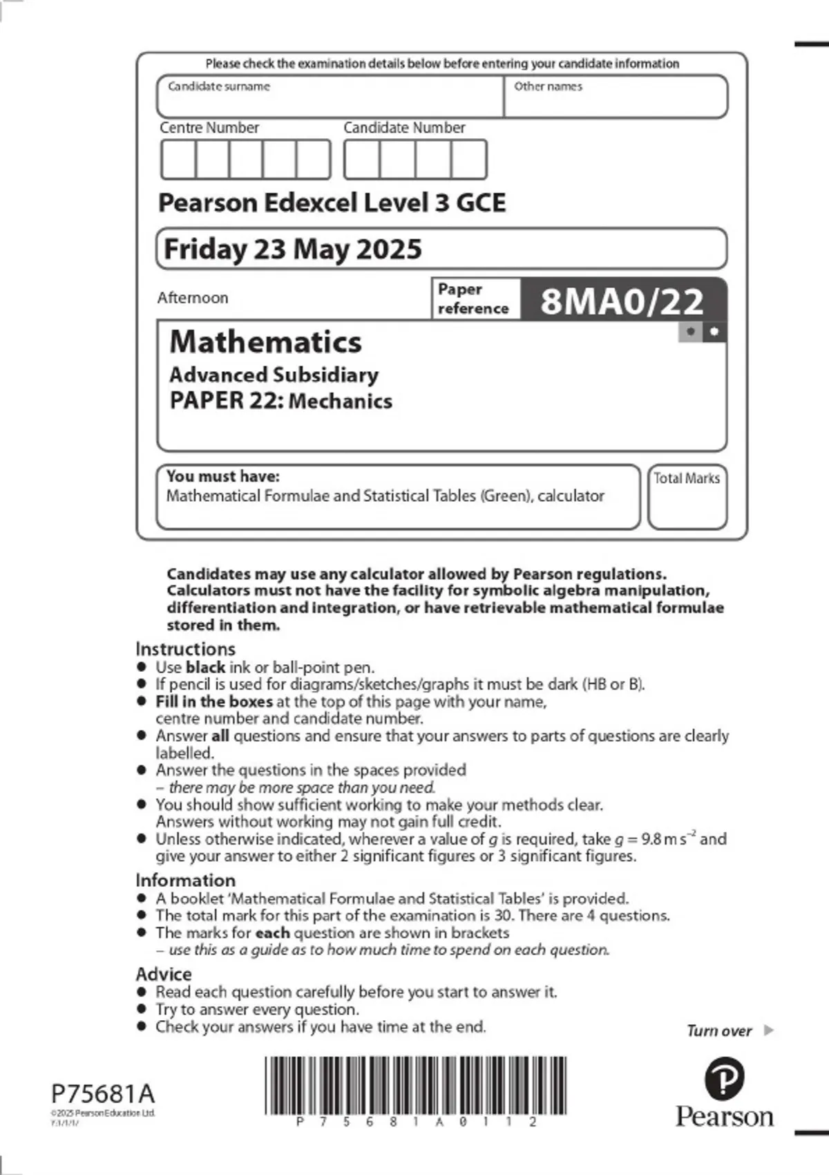 2025 Pearson Edexcel Level 3 GCE 8MA0/22 Mathematics Advanced Subsidiary PAPER 22: Mechanics QUESTION PAPER & MARKSCHEME (MERGED)