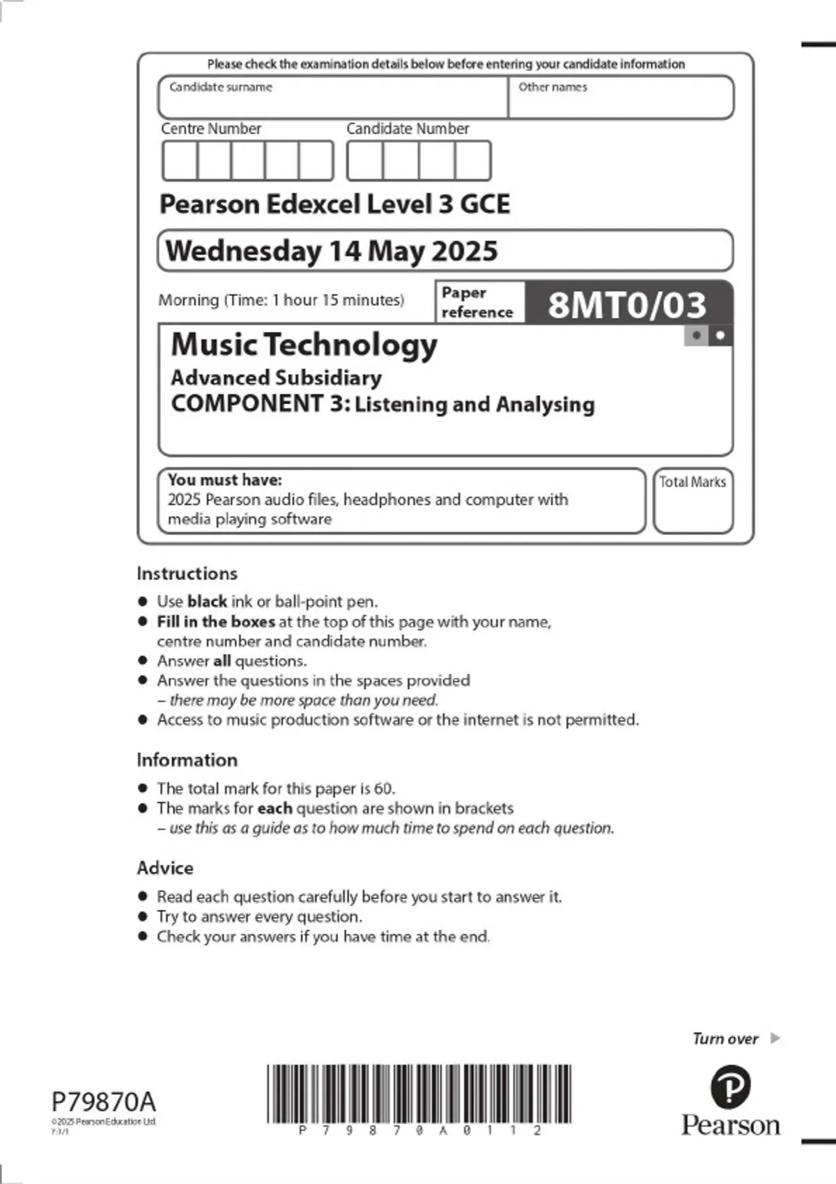 2025 Pearson Edexcel Level 3 GCE 8MT0/03 Music Technology Advanced Subsidiary COMPONENT 3: Listening and Analysing QUESTION PAPER & MARKSCHEME (MERGED)