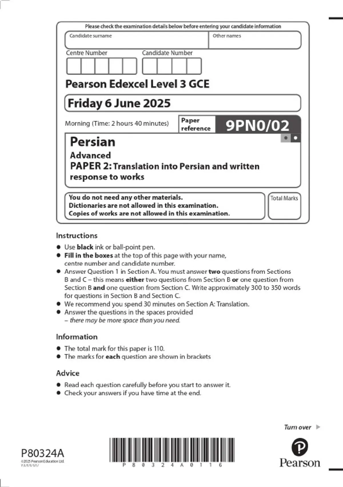 2025 Pearson Edexcel Level 3 GCE 9PN0/02 Persian Advanced PAPER 2: Translation into Persian and written response to works QUESTION PAPER & MARKSCHEME (MERGED)
