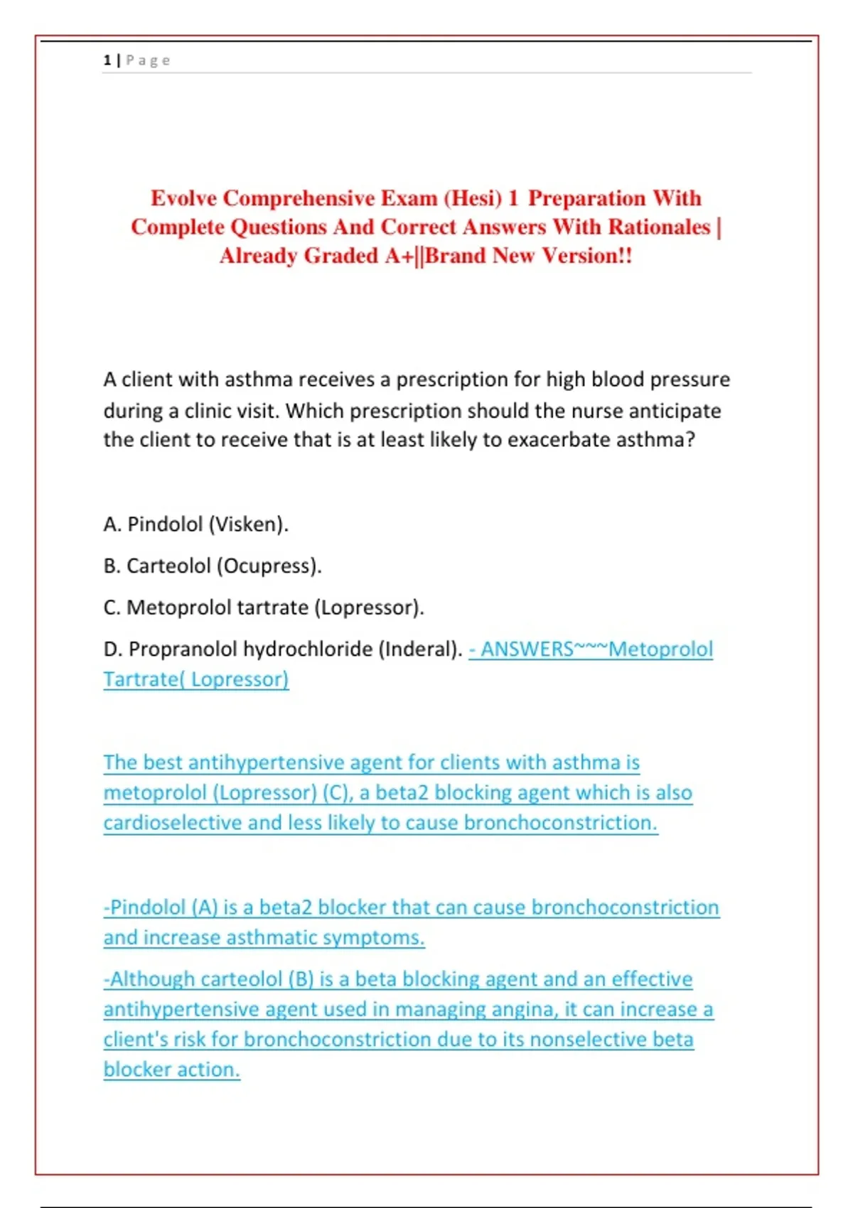 D. Propranolol hydrochloride (Inderal). - ANSWERS~~~Metoprolol